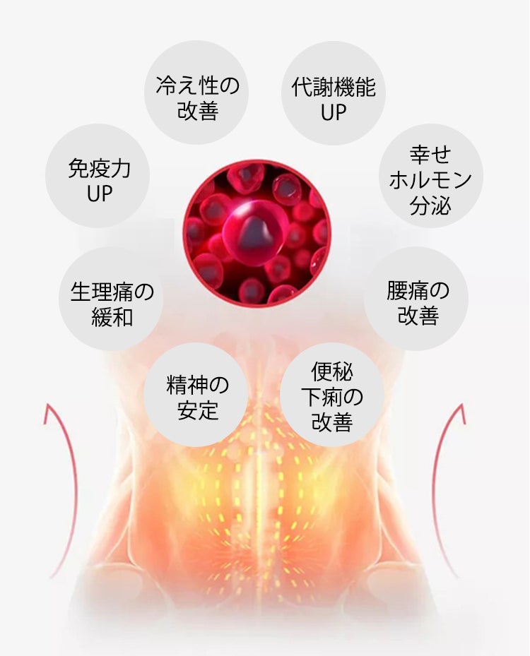 大切な臓器が集まっているお腹が冷えてしまうと、冷え性・腰痛・便秘や下痢・免疫力の低下など“体調”の不調だけではなく、“心”に不調が表れることも。お腹を温めることで「幸せホルモン」で知られるセロトニンの分泌も活発にしてくれます。セロトニンは精神伝達に重要な役割を持っており、理由のない不安やイライラの軽減に効果的。