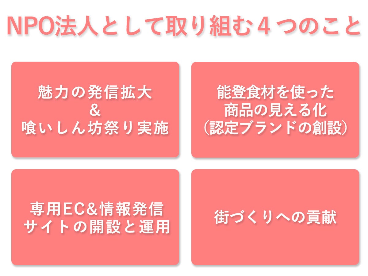 「能登食材××%以上使用」などの独自の基準を設定し、チーム能登喰いしん坊認定マークで能登にこだわった商品の見える化を推進していきたいと考えています。能登の商材を使った商品であると一目で分かることで、能登食材や製品のPRにより、売上の拡大や能登食材を使った積極的な商品開発の促進に繋げたいと考えております。