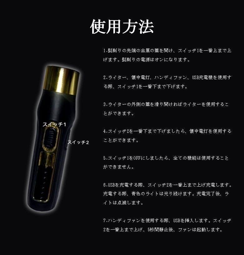 これ一台でただのシェーバーではなく、懐中電灯、ライター、ハンディファン、モバイルバッテリーと五つの機能で使うことができます。旅行や外出などする際にこれ1つあれば沢山の役に立ちます。たくさん持っていく必要がないのでこれ1つあればある程度の事が行えます。