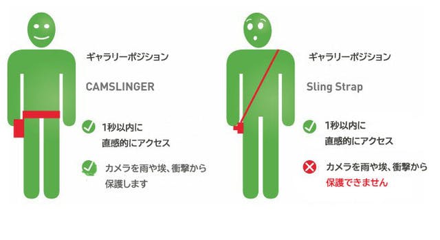 カムスリンガーは固定ベルトが装備されていて、腰の周りを自由に移動できます。
