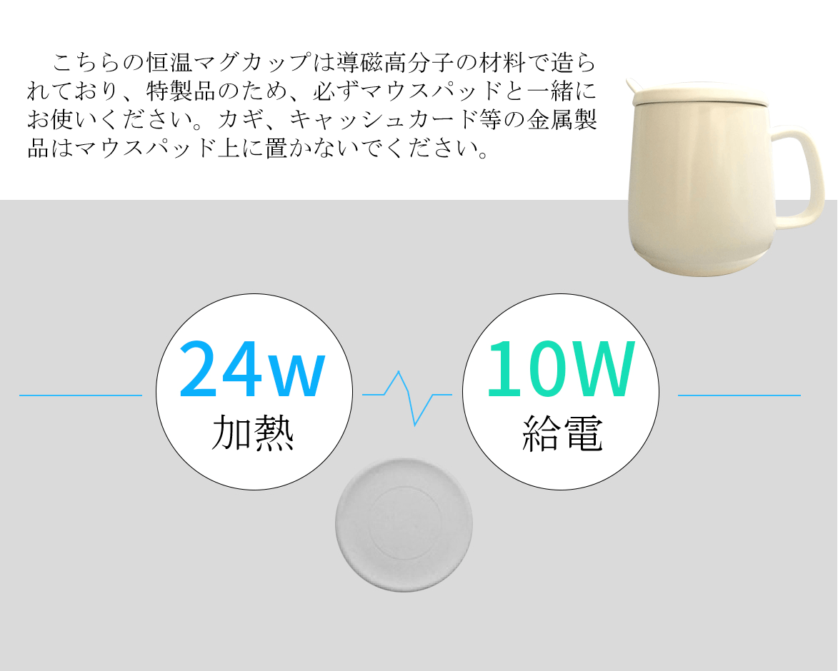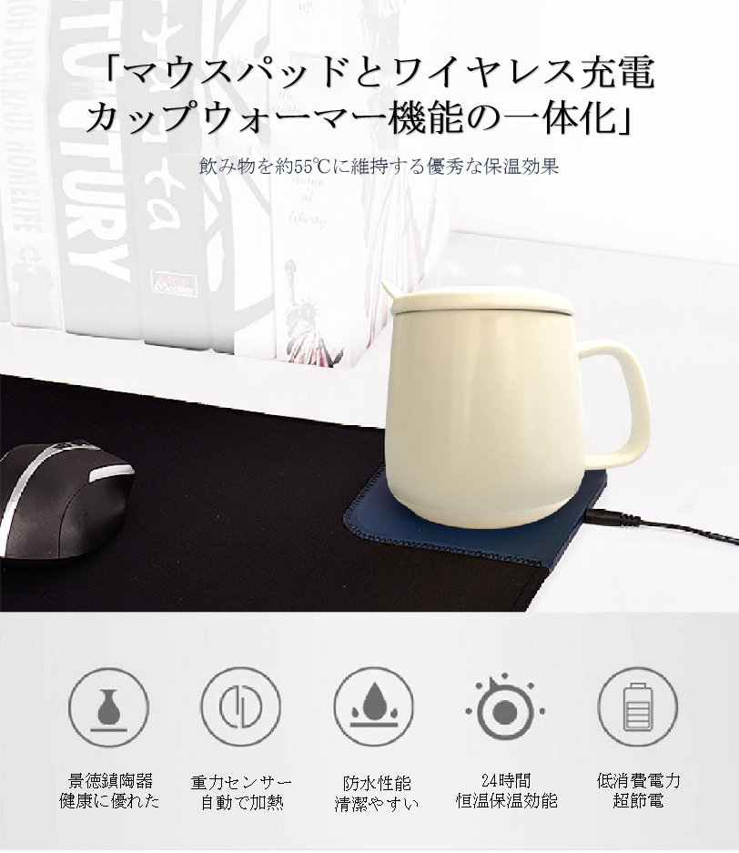 マウスパッドの上に置くだけで、重力センサーで感知するため、自動に加熱します。24時間の恒温保温効能でいつでも暖かいまま召し上がることができます。低消費電力のため、節電します。