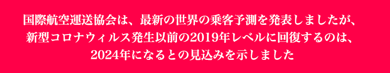 緊急事態宣言解除以降は、コロナ禍の影響は残りますが、少しずついつも通りの日常が戻り始めています。しかし海外渡航は依然として実質不可能な状態が続いております。国際航空運送協会(IATA)は、最新の世界の乗客予測を発表しましたが、新型コロナウィルス発生以前の2019年レベルに回復するのは、2024年になるとの見込みを示しました。