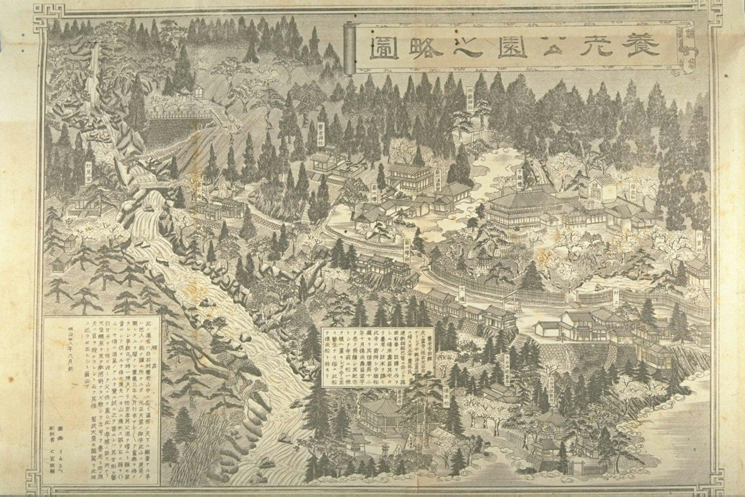 「千歳楼」は岐阜県の西南部、濃尾平野の西端に位置する養老町養老公園の中にあります。養老公園は、1880年開園という都市公園では屈指の歴史ある公園で、養老の滝を中心に飛騨美濃さくら33選に選ばれた桜、環境省のレッドリストに載る淡水魚のハリヨ、紅葉やカエデの紅葉など四季折々のさまざまな資源に恵まれています。 この養老公園のある養老山地は水が豊かで、「滝の水がお酒になった」という親孝行の孝子伝説の滝として知られている養老の滝や環境省の名水百選に選ばれている菊水泉が有名です。