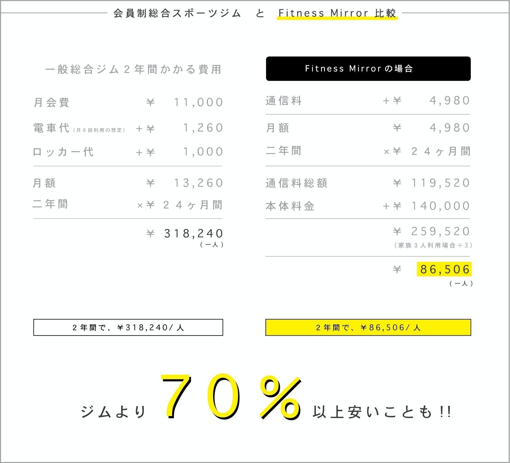 一般総合ジムの月額料金が11,000円、その他にロッカー代やジムへの交通費など、フィットネスライフを送る上で、出費は諸々出てしまうもの。自宅をジムにしてしまうFitness Mirrorはコスト面でも優位性があります。