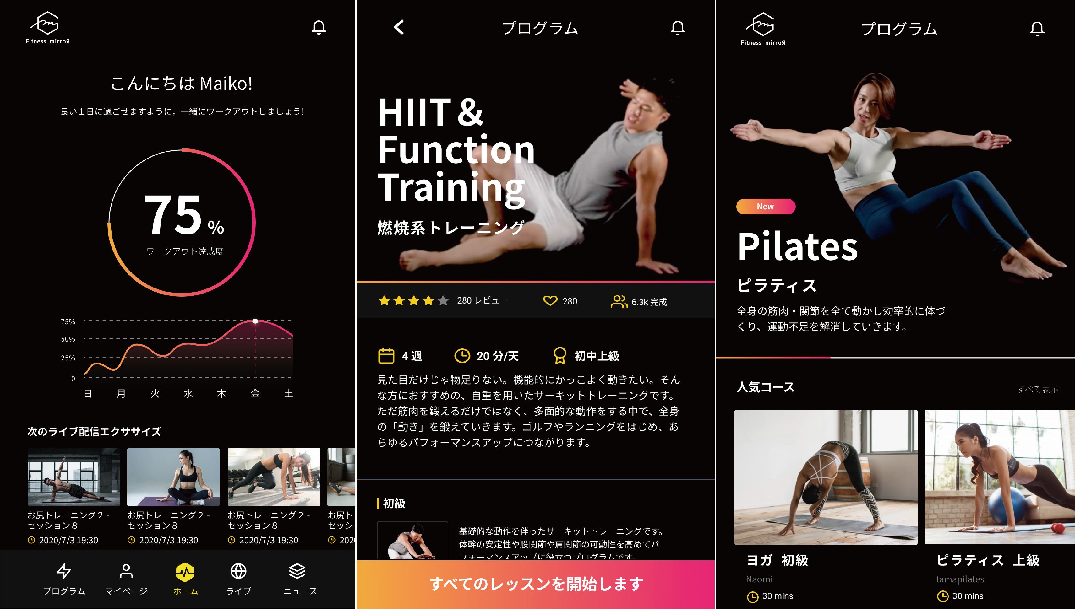 ヨガ、ピラティス、美ボディレッスンから、ハードなマニア向けの筋トレ、HIIT(高強度インターバルトレーニング)、痛み・姿勢改善などのフィットネスコンテンツのほか、Fitness Mirrorには、ゴルフレッスンや子どものためのリトミック、英会話など、ウェルネス、カルチャーコンテンツもご用意しています。そしてコンテンツは今後も続々と追加していきます!