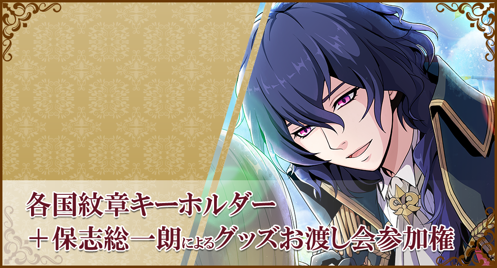 「SSRカードイラスト特製アクリルブロック 」と「各国紋章キーホルダー」のグッズをスーパーバイザー・ 保志総一朗が直接手渡しで貴方にプレゼントします!