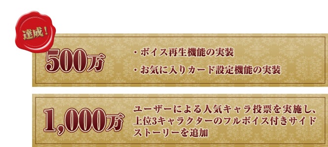 目標金額1000万円達成で、「ユーザーによる人気キャラ投票を実施、上位3キャラクターのフルボイス付きサイドストーリー」を追加いたします!
