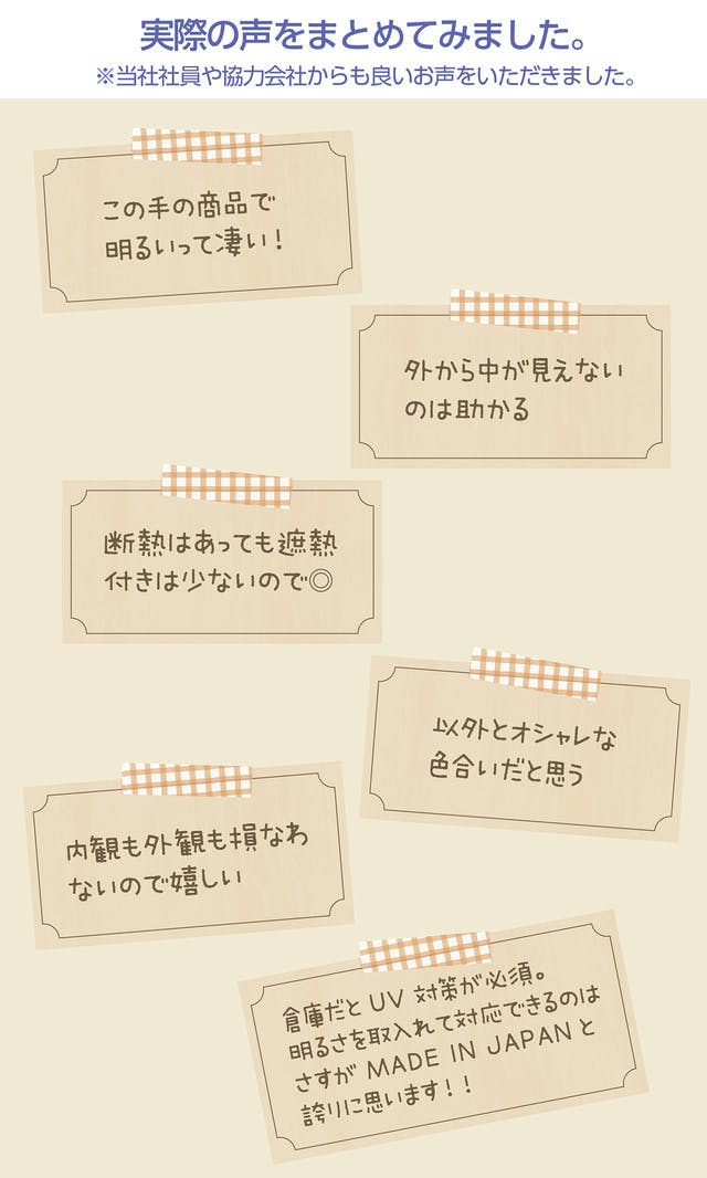 冒頭にも申し上げましたが私共は遮熱・断熱のスペシャリストとして様々な製品を日本国内の企業や消費者の方へ、また海外の方々へご提供しております。日本国内や海外工場とも提携し、高性能を保ちつつ低コストを実現・・・を目標に日々努めております。