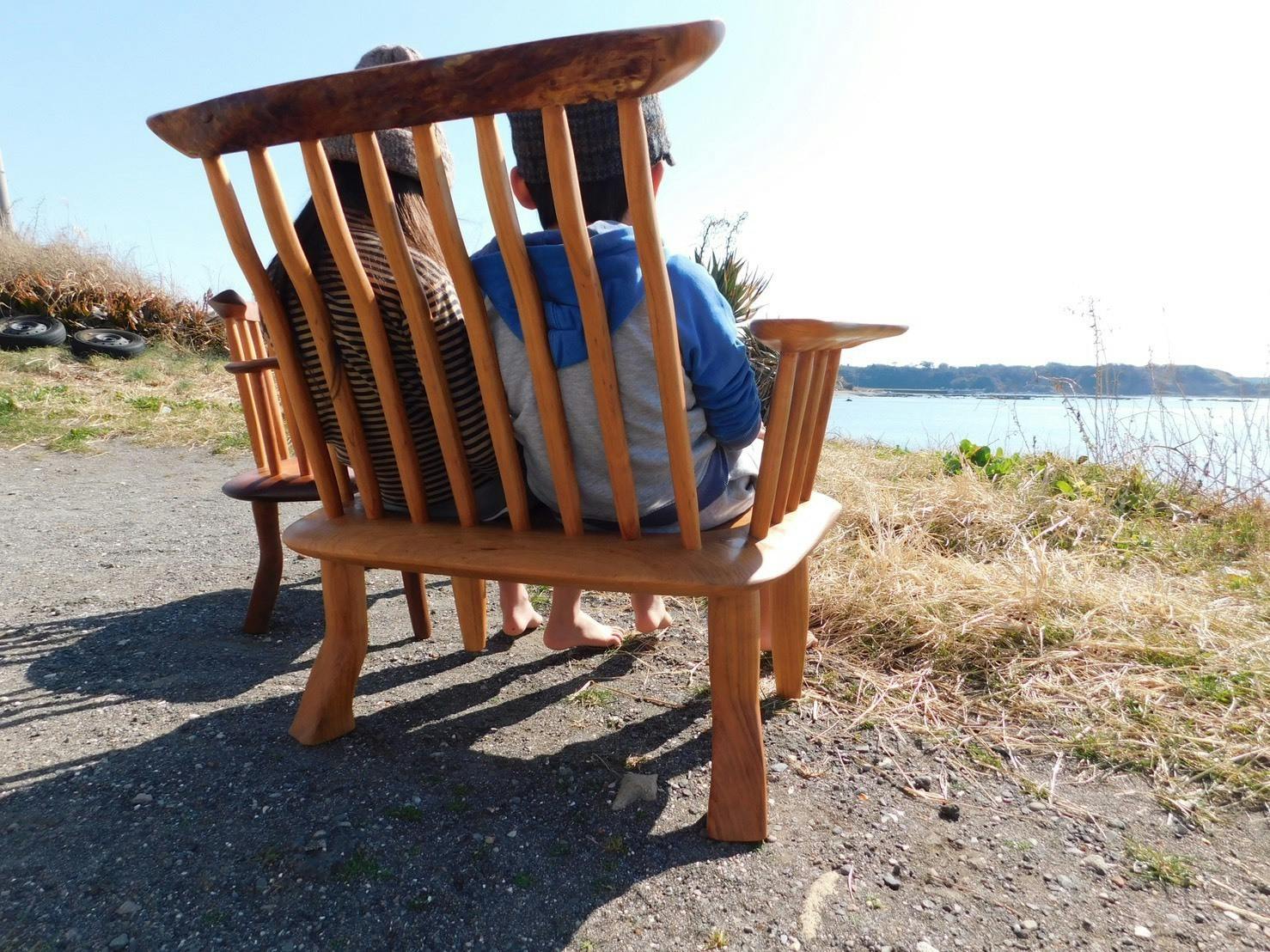 縦格子の背もたれと左右異なる高さのアームが特徴的で、座面にはケヤキの波模様が浮き出ているとても美しい美術品のようなチェアです。子供2人が腰掛けるのにちょうど良く、大人がゆったりと座ってもちょうど良く、ずっと座っていたくなります。