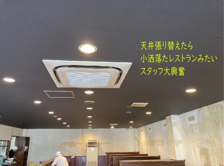 壁紙と天井の張替え、BOX席の新設、今の店内は絶賛リニューアル中です。大がかりなことはもちろんプロにお願いしますが、できるところはスタッフも加わり、自分たちの手でやっています。