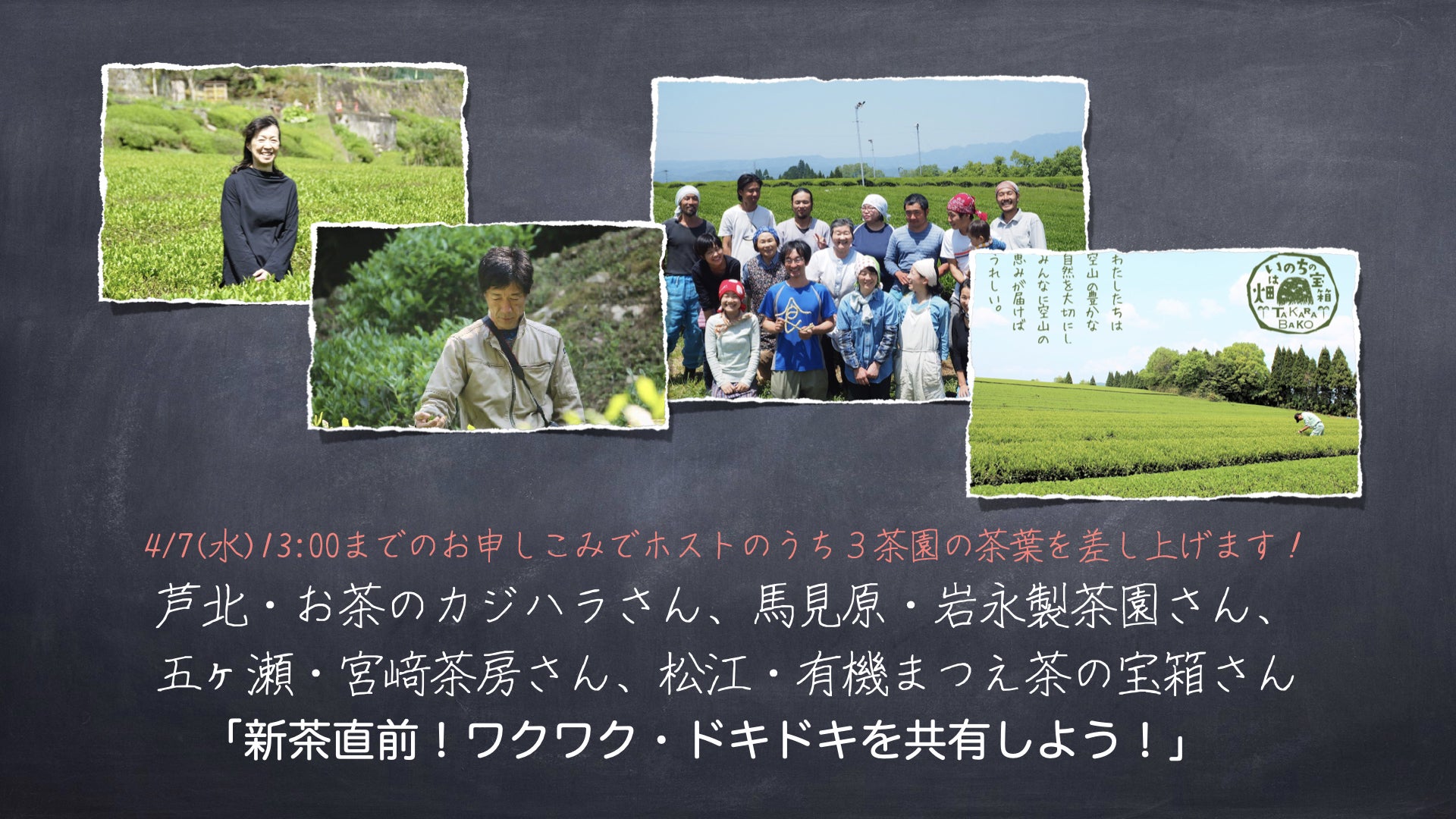 2021/04/05 18:464月7日(水)13:00までにお申し込みの方にはホストのうち3茶園のお茶をプレゼントします! 新茶直前はワクワク・ドキドキ! そんな作る人の気持ちを共有して、飲む人はお茶の思い出や、好きなお茶を飲むシーンとか、ホスト茶園のお茶を飲んだ感想を伝えて、みんなの力を作る人の力にしてもらいましょう!! 今回はそんな双方向おしゃべりを中心に楽しく進行しまーす!!zoomでの開催です。司会が作る人たちのお話しを引き出しておしゃべりが進行するので安心です。最近は毎回6〜10名の飲む人が参加しています。おしゃべりが苦手な方は聞く専門でもOKです。お気軽にご参加ください!<ホスト紹介>※順不同・お茶のカジハラ・梶原敏弘さん「お茶で人を笑顔にしたい。日本の大事な文化を次世代に継承したい。自分が一番専念したいことはお茶作りで、無限の可能性を持つお茶の魅力がたまらなく好き。」http://www.kajihara-chachacha.com/company.html・岩永製茶園・門内智子さん「うちの茶の木は老木なので、樹に負担をかけないよう心がけながら手入れしています。工場では父が残した古い道具や機械で、少しずつ母と二人で丁寧に茶を作っています。」https://tokyoteasummit.stores.jp/?category_id=5faf85e1da019c547219e873・宮﨑茶房・宮﨑亮さん「飲んだら元気になるようなお茶づくり」有機無農薬の品種の王様とオンラインお茶会では呼んでいます。http://www.miyazaki-sabou.com/company/・有機まつえ茶の宝箱・松浦照美さん「畑はいのちの宝箱。私たちは“いのち豊かな土づくり”を信条とし、創業時から自家製の植物性堆肥を使用して有機農業を行っています。」https://www.e-takarabako.com/<タイムライン>【前半】14:00~14:40 ・ホストの茶業近況報告・今年のお茶はどんな感じに仕上がりそう?【後半】20:50~20:30 ・作る人と飲む人のフリートーク<参加方法>※イベントページ冒頭には料金無料と表示されていますが、Facebookのシステム上の用語で「このイベントコンテンツを無料で閲覧できる」ということらしいです。以下が参加料金です。ご了承ください。①一回チケット¥350https://tokyoteasummit.stores.jp/items/606417fdd5e9c93f7f45754f②【絶対おすすめ】4月+5月+6月3monthsパスポート¥2500https://tokyoteasummit.stores.jp/items/60640b672305574a62130184・特典1:4~6月中なら何回参加してもOK!・特典2:10茶園の茶葉プレゼント付き。・特典3:各イベントごとに告知されている期日までのお申し込みで毎回の茶葉プレゼントももらえます。 ★10日にご参加の方も必ず7日13:00までにメールにて「10日参加希望」とご連絡ください。→tokyoteasummit@gmail.com・茶園での新茶作業実況配信など、パスポート会員さまだけのコンテンツも楽しい!参加費は作る人を応援する当オンラインお茶会運営のために全額使われます。ーーーーーーーーーーーーーーーーーーー※〆切は当日13:30です。※ご購入後は開催日前日にイベントURLを送りますので、メールのチェックをお願いいたします。(当日ご購入の方へは13:50までにURLを送ります。) もっと見る