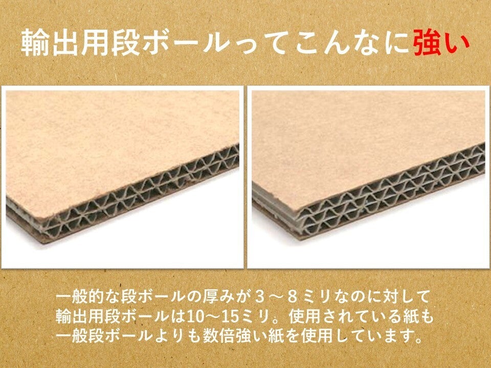 我々が使用している輸出用の段ボールは、木材の代わりに使用されており強度も高く、耐水性の高い紙を使用することによって多少の水濡れも平気です。