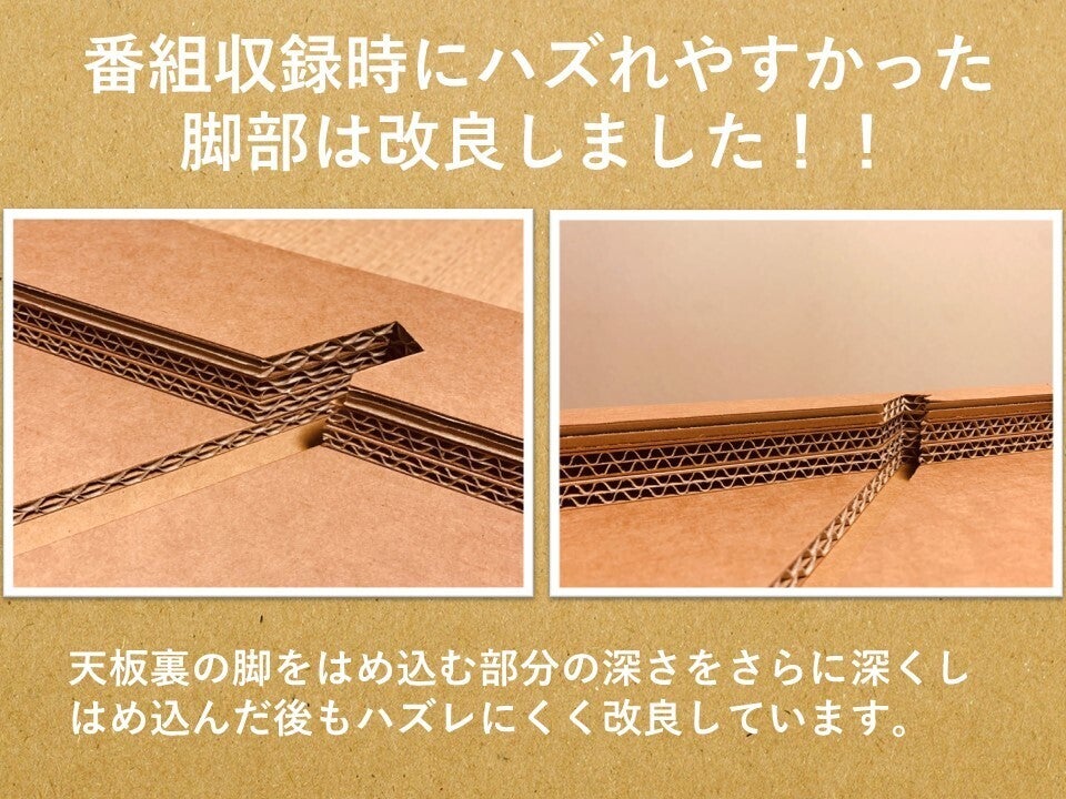 番組収録時には組立時に脚が外れてしまいましたが、今回のクラウドファンディング開始までに改良してハズレづらさを解消しました。