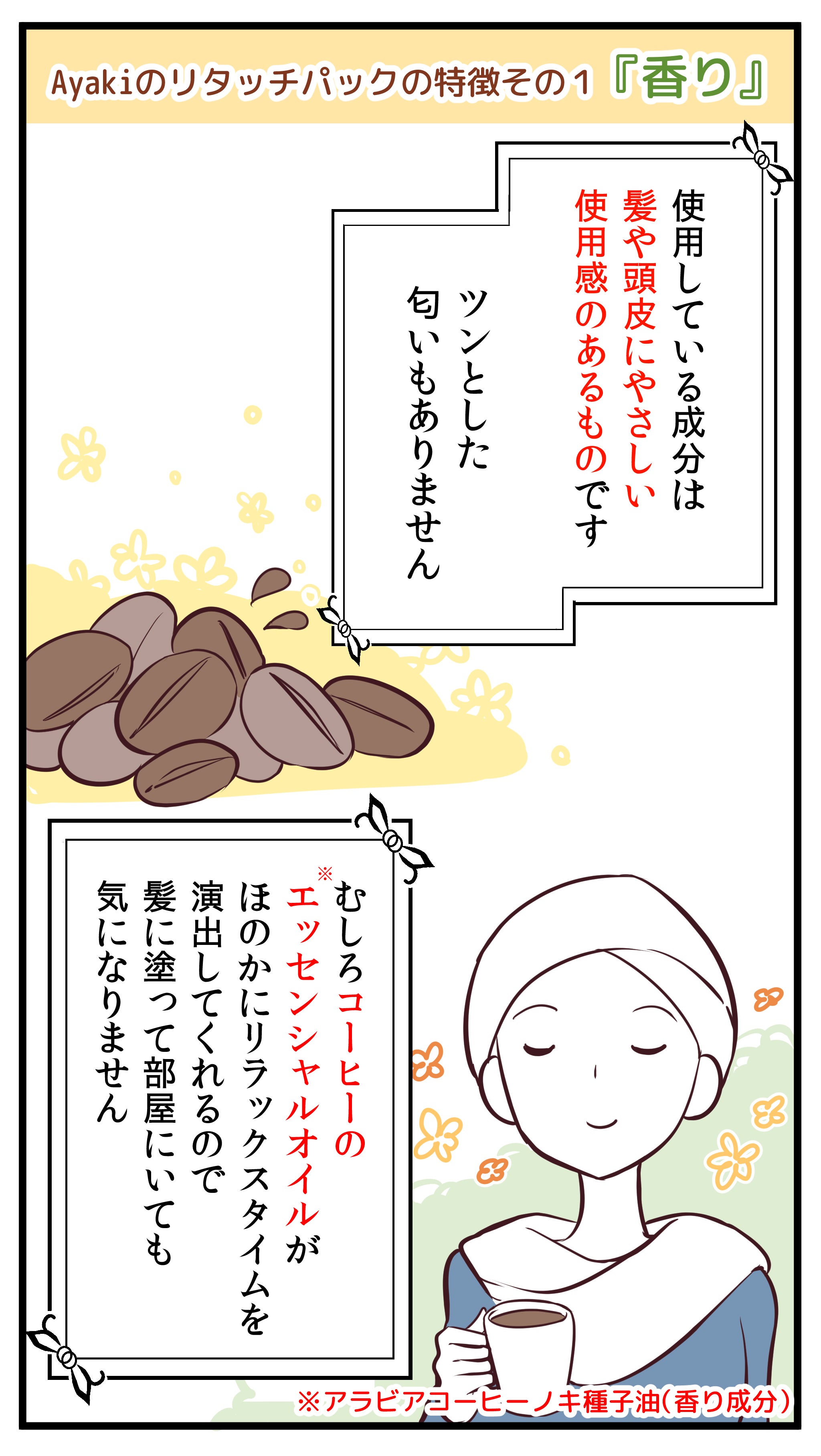 ayakiのリタッチパックでは髪や頭皮を考えたものを使用しています。あのツンとする香りの元になる成分も入っていません。