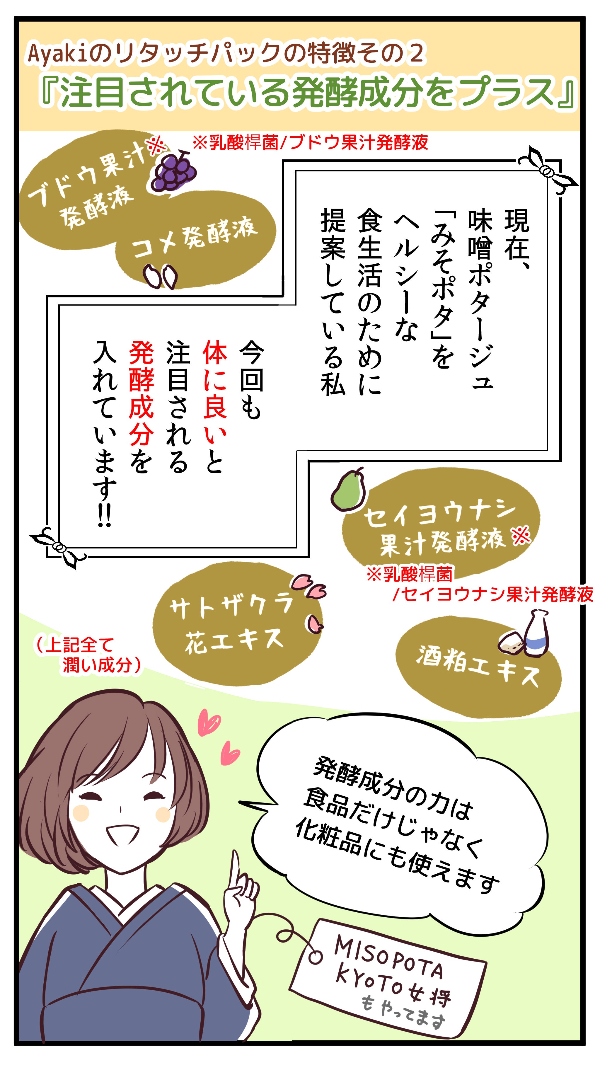 「みそポタ」=味噌ポタージュスープを提供しているのですが、事業をはじめてからも益々発酵食品の素晴らしさに魅せられ、ayakiのリタッチパックにも体に良いと注目される発酵成分を入れています。