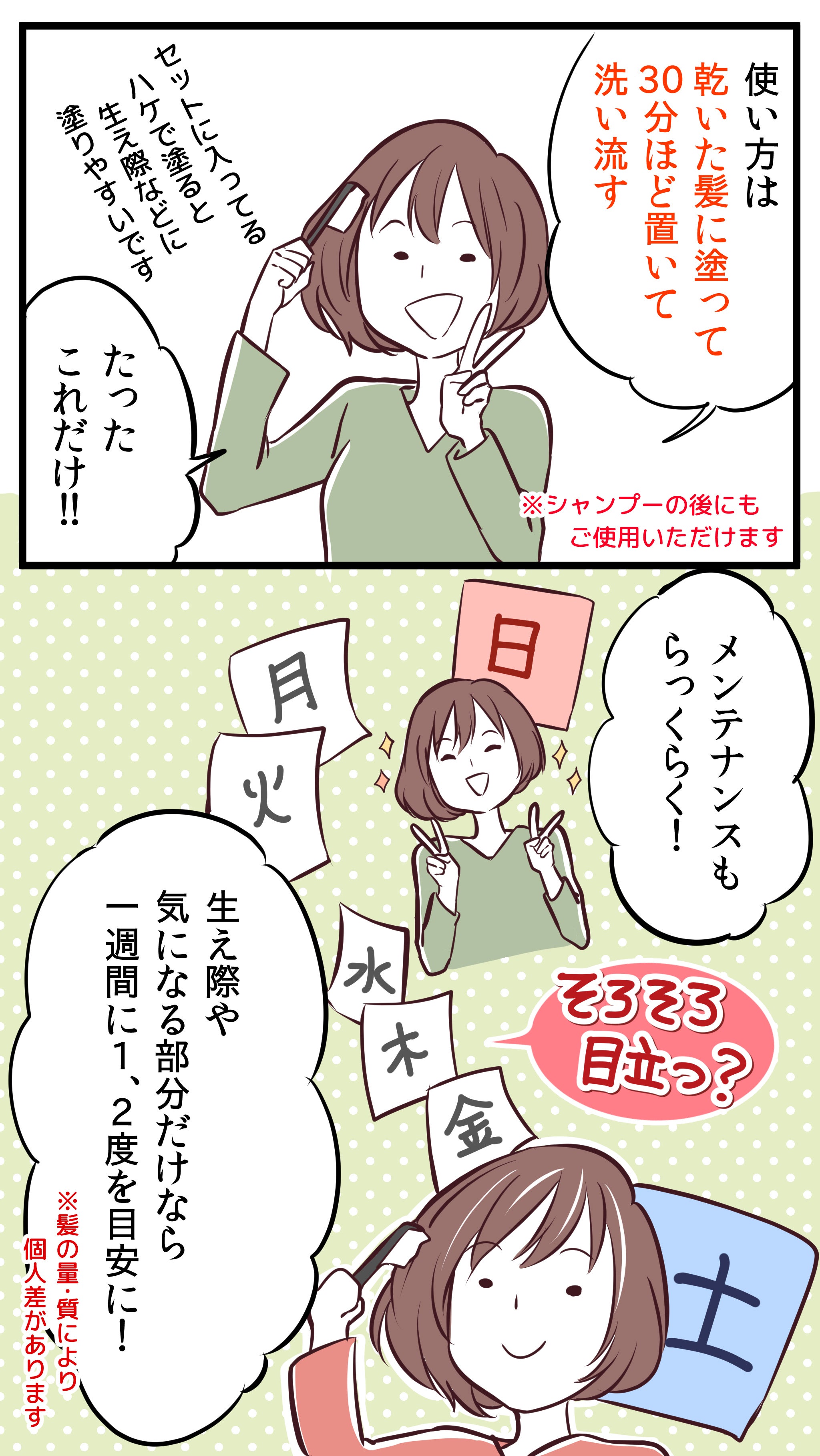 私は美容院には以前約2-3週間に1度白髪メンテのために通っていたのですが、リタッチパックの試作品を定期的に使用することで今は約2ヶ月-2.5ヶ月に1度程度になりました。
