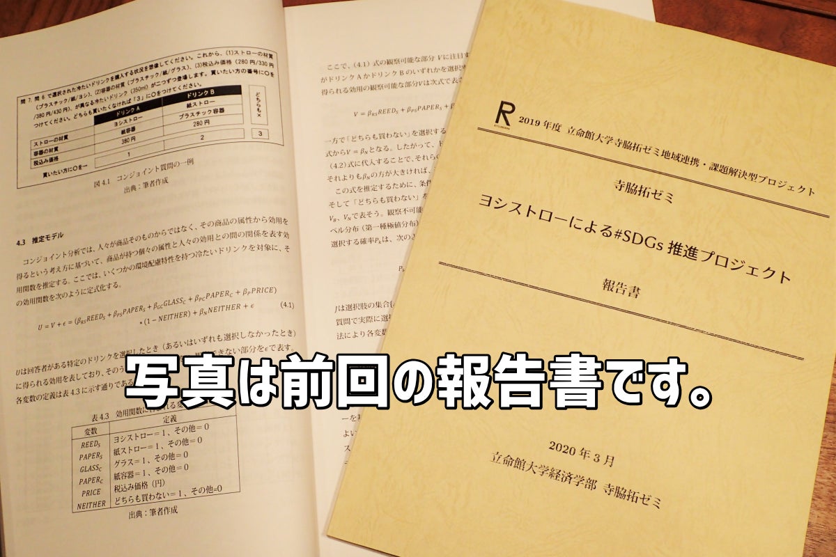 2019年に取り組んだ「ヨシストローによる#SDGs推進プロジェクト」では、びわ湖に生育するヨシを使ってストローを作り、そのヨシストローに対して人々が支払ってもよいと思う金額(支払意思額)を計測しました。加えて、そのヨシストローを紹介するパンフレット「ヨシストローで#SDGs」を作成、配布いたしました(フルカラー、A4巻き三つ折り)。