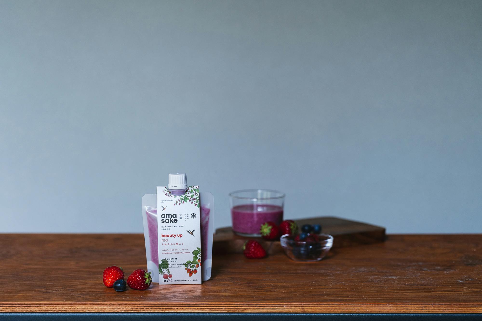 朝の通勤や、デスクワークの合間の軽食にぴったりな『米糀のあまさけ-beauty up red』は、いちご/ラズベリー/ビーツをかけ合わせたあじわい。
