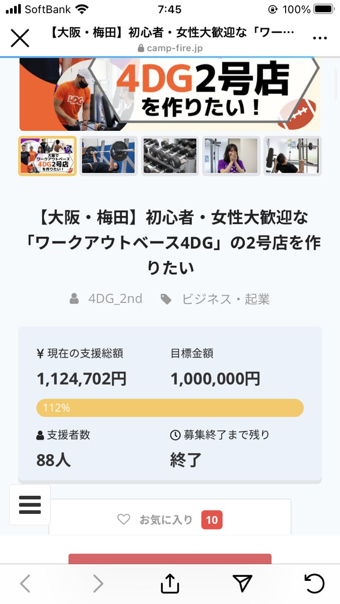 2021/01/31 09:51昨年、12/10からスタートしたクラウドファンディングが昨日の1/30で終了しました。88人の方から、合計1,124,702円を支援して頂きました。皆さん、一人一人の支援がなければ、目標金額の100万円を突破することもありませんでした。支援して頂いた方、また、今回のクラウドファンディングの実施にあたり、精力的に協力して頂いた方、本当にありがとうございました。皆さんの支援金はジムの器具、物件の費用に充てさせて頂きます。そして、素晴らしいジムになるように2/2のオープンに向けて、準備していきます。僕自身、初めてのクラウドファンディングは不安は多少あったものの、クラウドファンディングの実行を決めてから、・リターンの準備・サイト作成・クラウドファンディングの周知など全てのプロセスを楽しむことができました。今回のクラウドファンディングを通じて、本当に良い経験をさせて頂きました。オープン後の4DGの2号店の状況も随時、このメールにてお伝えさせて頂きますので、今後とも皆さんの温かいご支援、よろしくお願い致します。 もっと見る