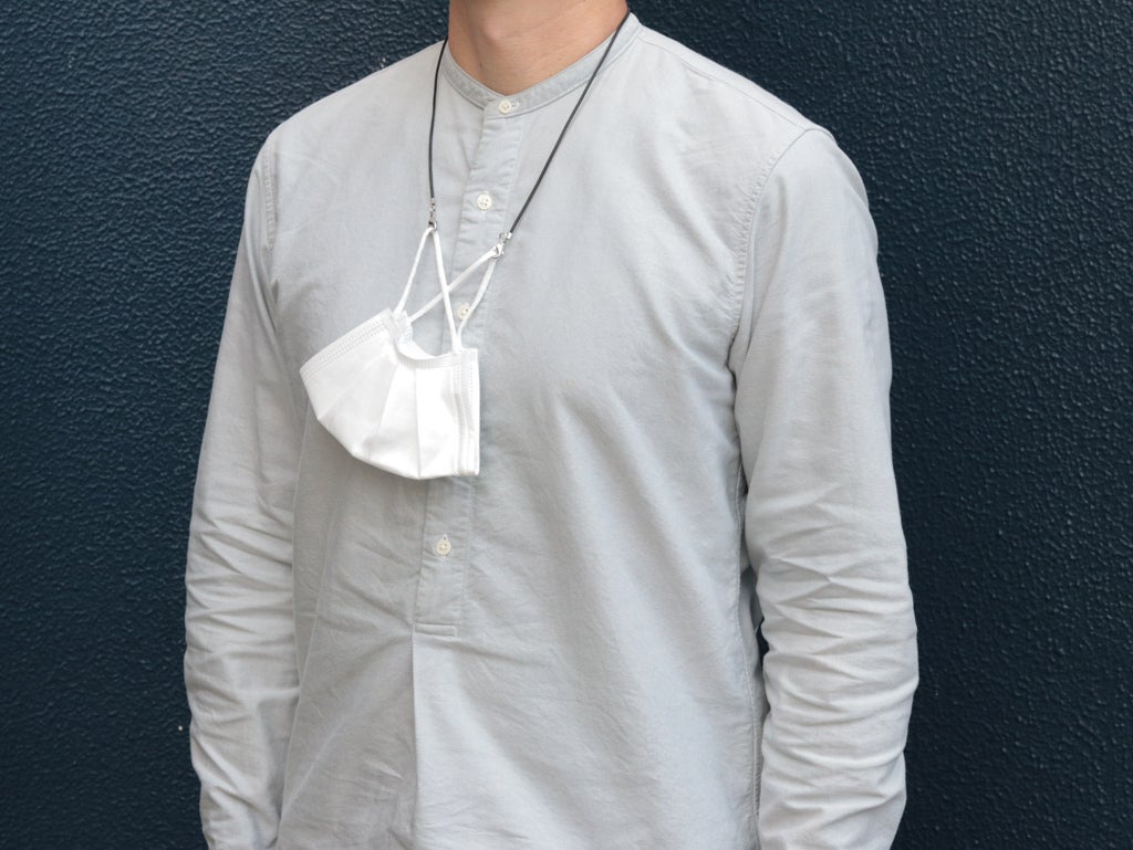 しかし、このように首からぶら下げておけばとても簡単に楽にマスクを外しておく事が出来ます。