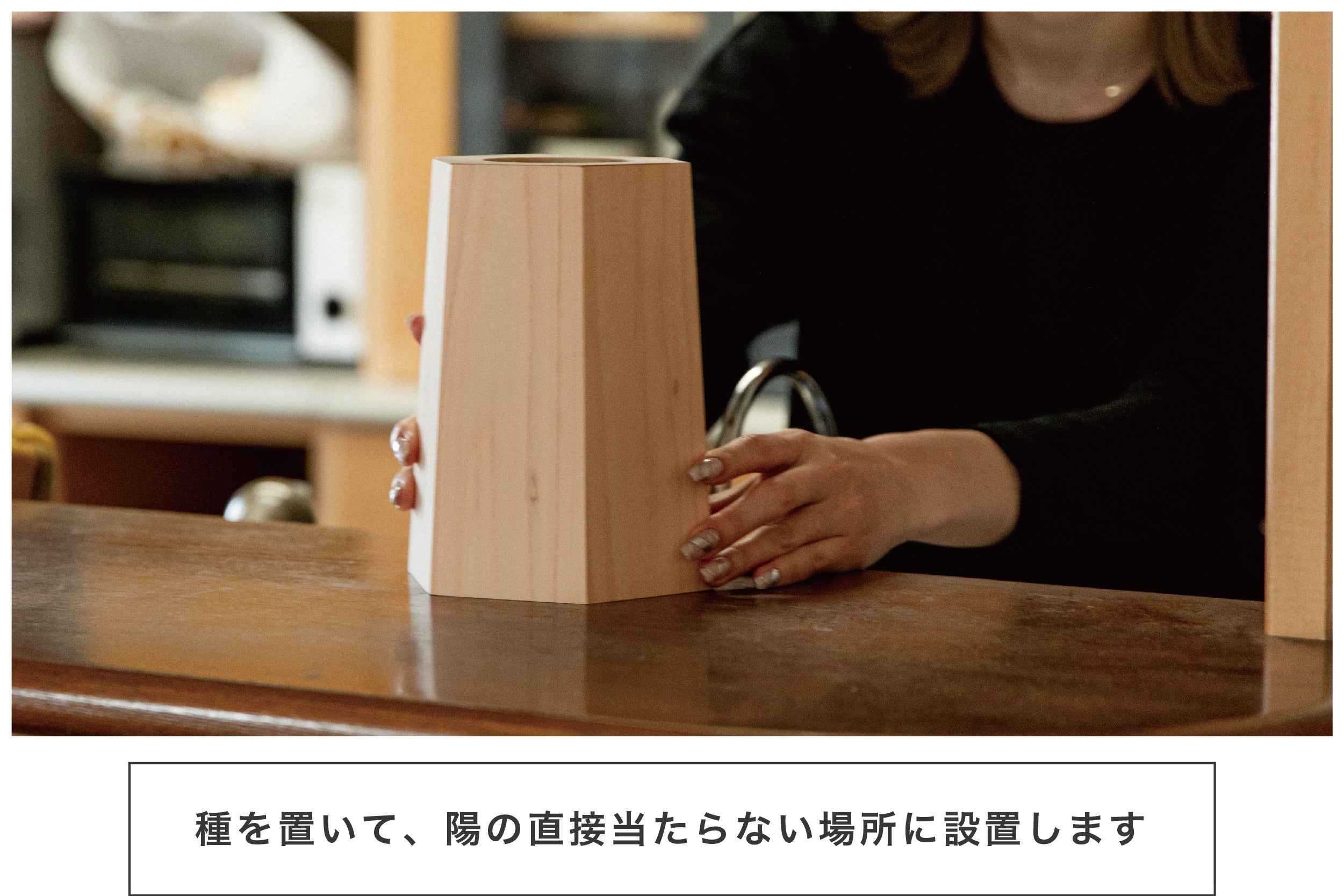 お部屋で育った後、一本の木として森の中で生き続け、50年後にはどなたかの生活に寄り添うものへと