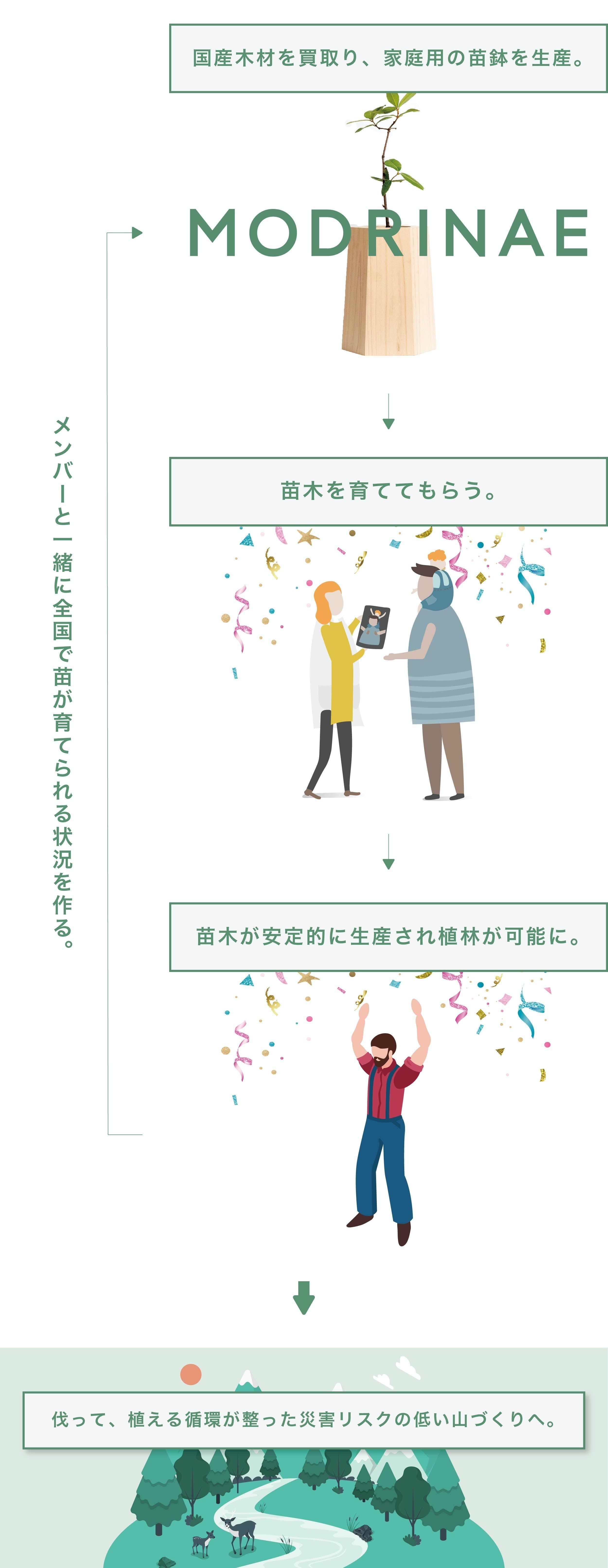 MODRINAEは、苗を育てることで「直接豊かな山づくりに貢献できる」そんな「新しい森林保全のカタチ」を作ります。