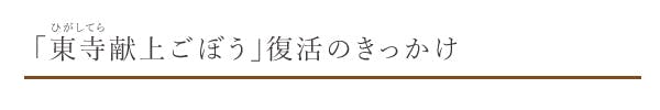 東寺献上ごぼうは、昭和天皇即位(昭和3年)後最初の大嘗祭が滋賀県で行われ、当時石部町東寺の特産のごぼうを献上しました。当時の献上ごぼうの碑は、私有地の一角でひっそりと佇んでいます。