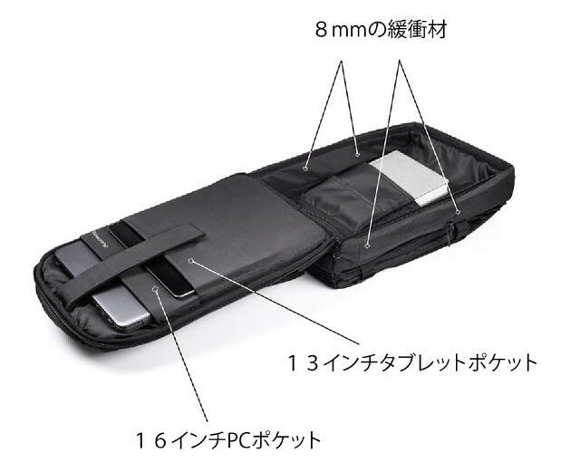 通常よりも厚い緩衝材を配したことで、PCやタブレットなど、ビジネスアイテムにも完全対応し、安全に持ち運ぶことができます。