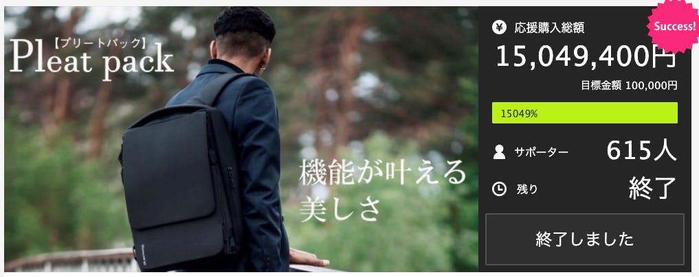2021/11/07 10:00PleatPackにご興味を持っていただいた皆様こんにちは、PleatPackチームです!本日はお知らせが2つありご連絡いたしました。この度、PleatPackを14,000件のプロジェクトから、CAMPFIREプロジェクトBest100に選出いただきました!ご支援いただいた皆様、ありがとうございます。そして、今回の受賞を記念して、ショルダーベルトへの名入れオプションを実装した受注生産の予約を受け付けております。是非お手隙の際にご覧ください!https://camp-fire.jp/projects/view/504593今後とも、PleatPackを何卒宜しくお願い申し上げます。 もっと見る配送状況のご報告②