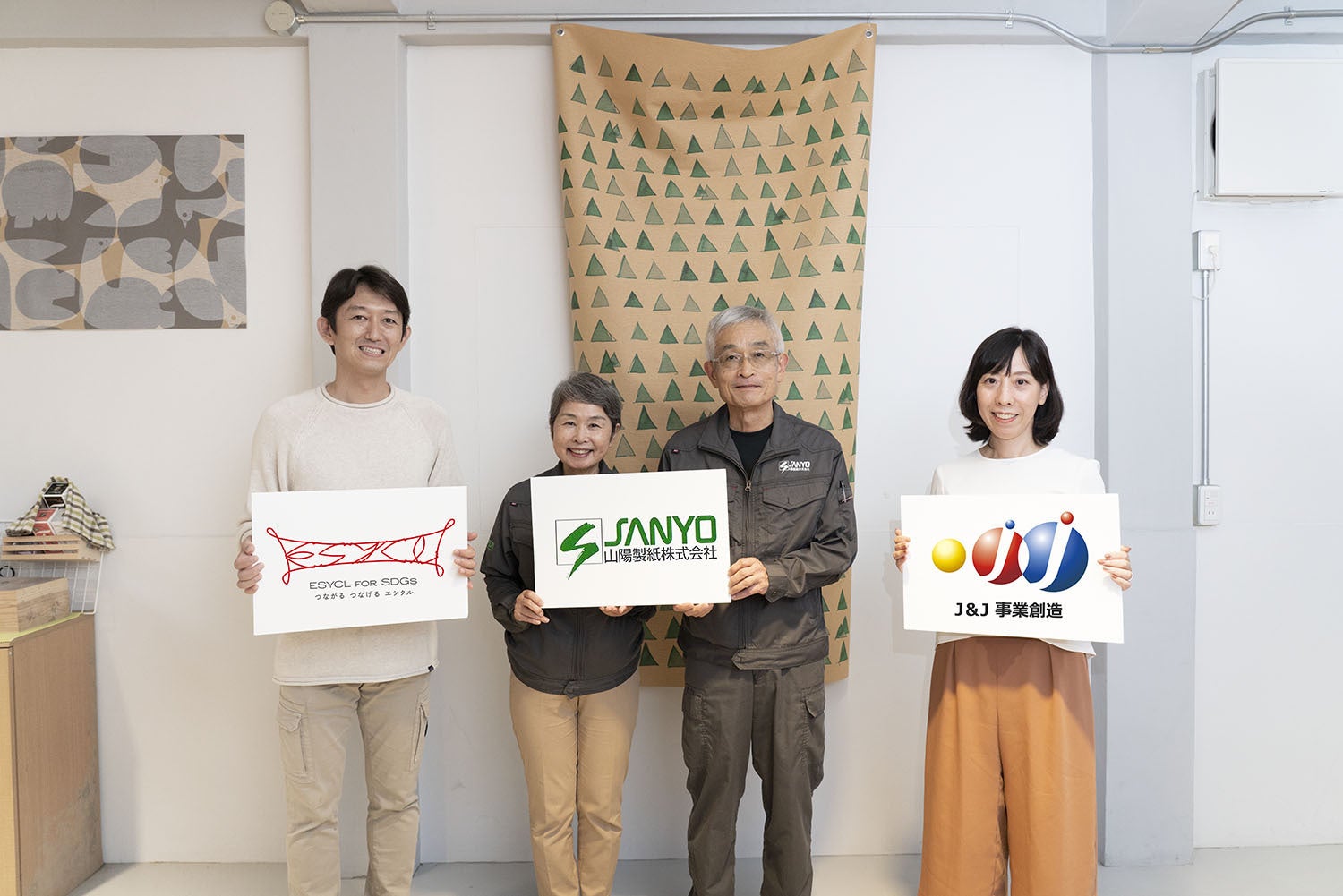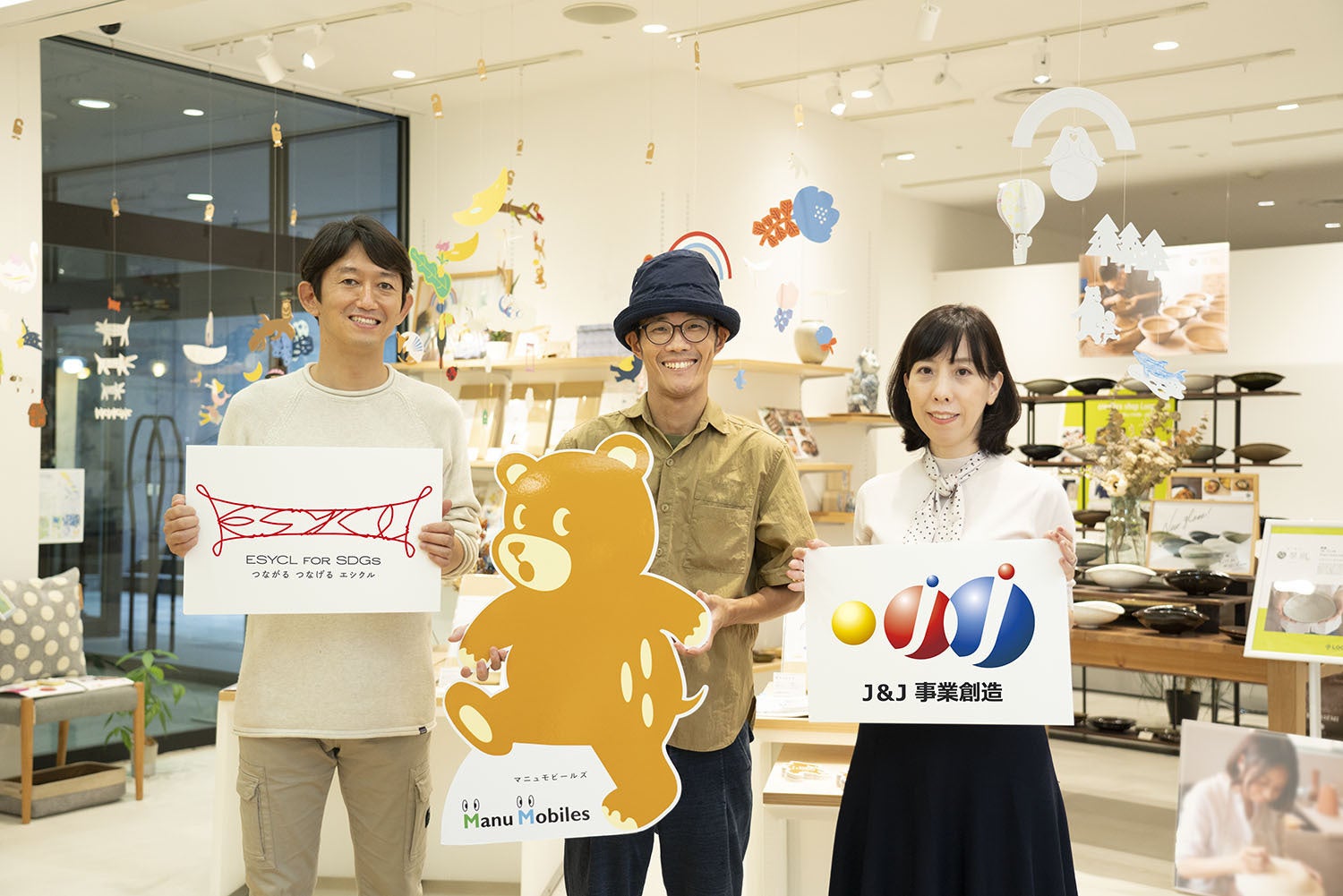 第一弾のプロジェクトでは、古紙の再生やアップサイクルに取り組む大阪府泉南市の山陽製紙様と、紙と糸を使って手作りのモビールの製作に取り組む 名古屋市のマニュモビールズ様のエシカルな活動を掛け合わせました。山陽製紙様がリサイクルした再生紙を用いて、マニュモビールズ様が福祉作業施設様とともに手づくりでアート作品(モビール)に仕上げます。