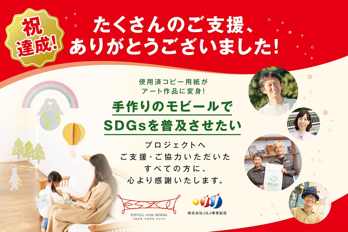 2020/12/01 06:3011/30をもちまして、「コピー用紙がアート作品に変身!手作りのモビールでSDGsを普及させたい」のクラウドファンディングが終了いたしました。みなさまからのあたたかい応援・ご支援のおかげで、目標を達成することができました。心から感謝を申し上げます。本当にありがとうございました!今回のクラウドファンディング初挑戦では、開始当初、SDGsへの関心度やモビールの認知度など悩むことも多かったですが、時が経つにつれて 支援の輪が広がり、人と人の繋がりや優しい気持ちを強く感じ、心が熱くなりました。みなさまからの思いをしっかり受け止め、持続可能な未来の発展を目指して、一歩一歩着実にプロジェクトを実行してまいりたいと思います。リターンの「SDGsをテーマにしたモビール」は、来年の1月中旬にはお届けさせていただく予定です。一時期は、新型コロナウイルスの影響で、障がい者の方々が働く作業所の閉館などが起こり、生産もストップしていました。現状まだ全て復旧しているとは言えませんが、本人たちの働きたい(社会に関わりたい)という思いは尽きることなく、みなさまのご支援が大きな力となり、モビールの製作に励み続けています。エシクル for SDGsは、社会や環境に良い活動を掛け合わせて、新たな価値の創造や価値の拡大を図る事業です。また、支援者のみなさまとともに正の連鎖と循環の輪を描きながら、SDGs達成に向けた主体的な行動を促すことも目標としていますので、是非、みなさまにお届けするモビールをSDGs促進にお役立ていただけると嬉しい限りです。なお、みなさまからの支援によって開催されるSDGs理解促進セミナーやイベントの様子など、今後の活動につきましては、エシクル for SDGsのホームページ等で随時お知らせさせていただきます。これからもみなさまとともに持続可能な未来の発展を目指してまいります。たくさんの支援と応援、本当にありがとうございました! もっと見る