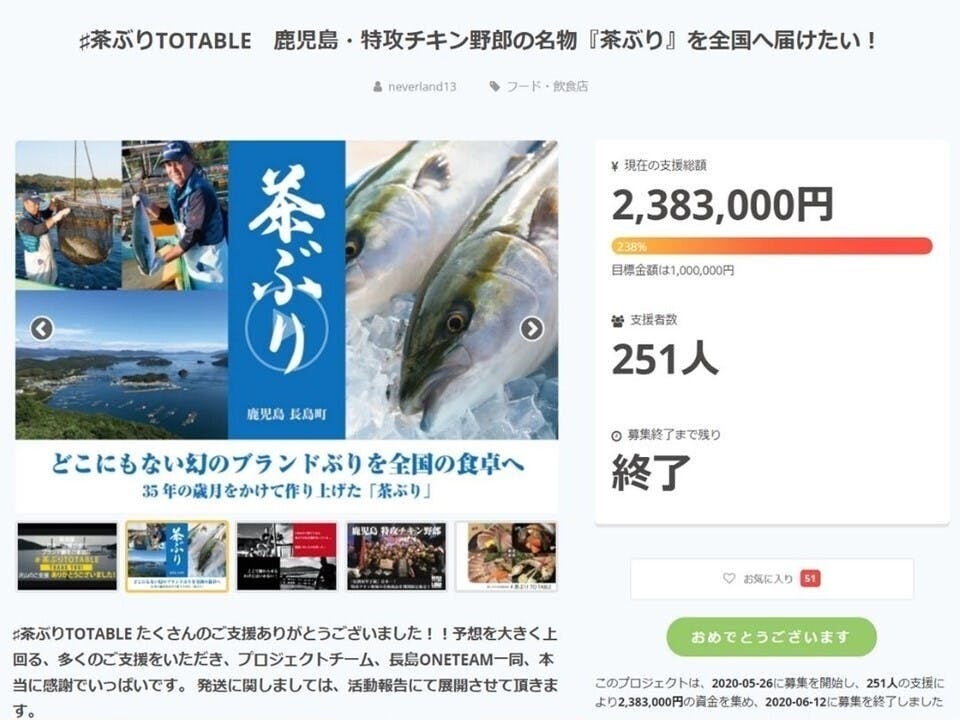 初めてのクラウドファンディング・プロジェクトである第1弾「#茶ぶりTOTABLE」では、総支援者251人、目標達成238%を記録し、日本全国、本当に多くのご支援者の皆様に「茶ぶり」をお届けすることができました。店舗のお客様はもちろん、初めて茶ぶりを食べていただいたお客様にも大変喜んでいただきました。また同時に、「こんな美味しいぶりたべたことない!」「贈り物として送った相手の方から絶賛の声をもらった!」「茶ぶりの美味しさを広められました!」などなど、本当に沢山の嬉しいメッセージも頂戴しました。