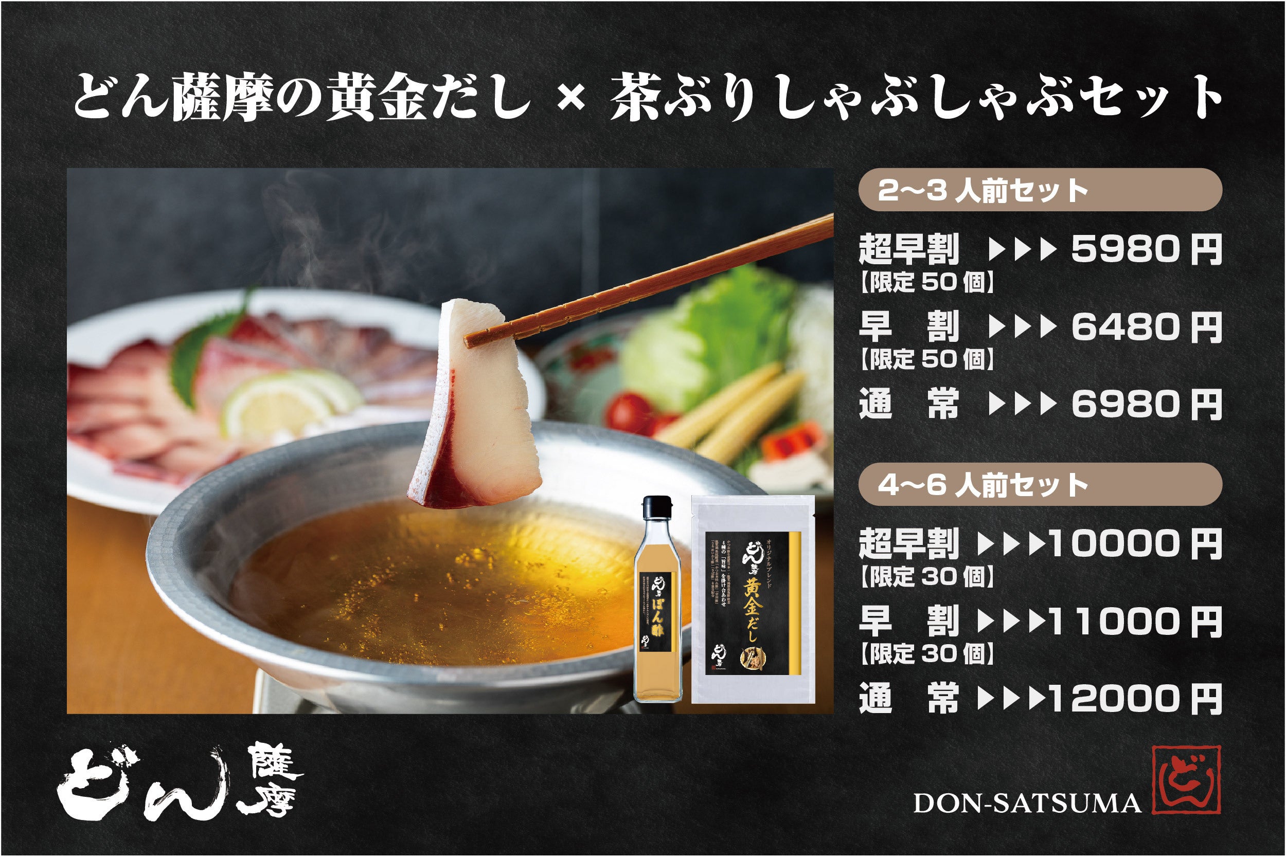 店舗の味をよりお手軽に再現していただく為に、「茶ぶりの切り身パック」「どん薩摩の黄金だしスープ」「どん薩摩のぽん酢」を商品化。さらに今回は柚子胡椒と〆のうどんもセットにしました!