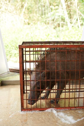 箱罠を使って捕獲し、生きたままイノシシを専用施設に搬送することで鮮度が高く衛生的な肉の生産を行っています。