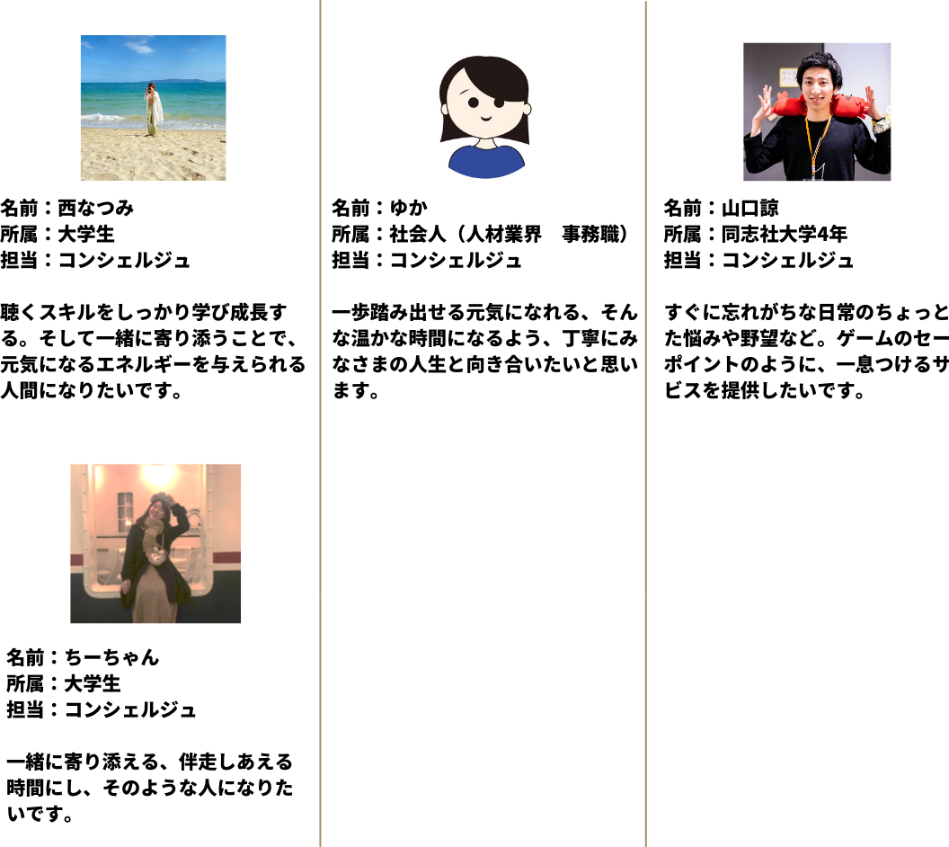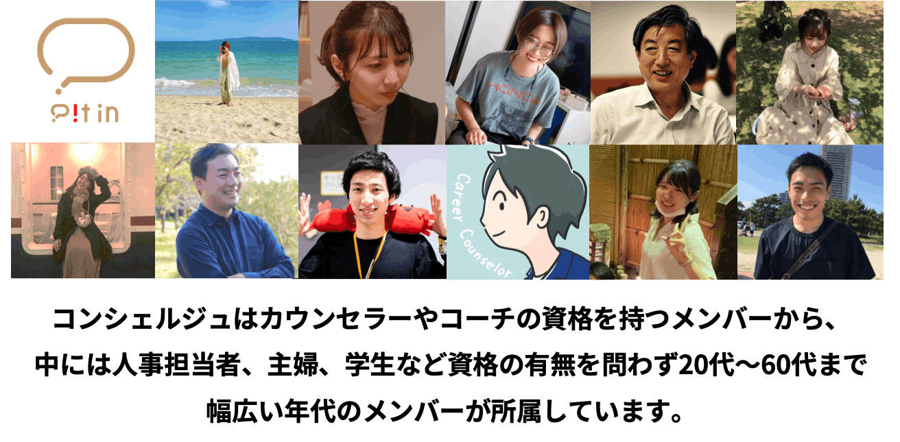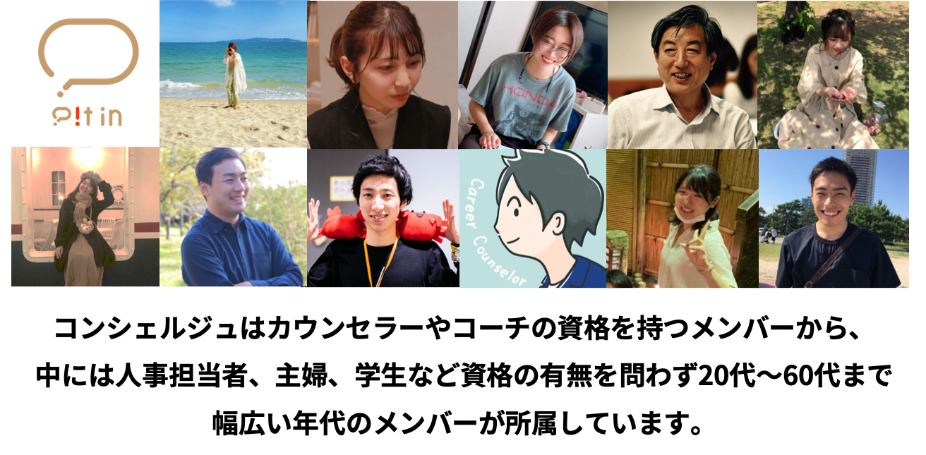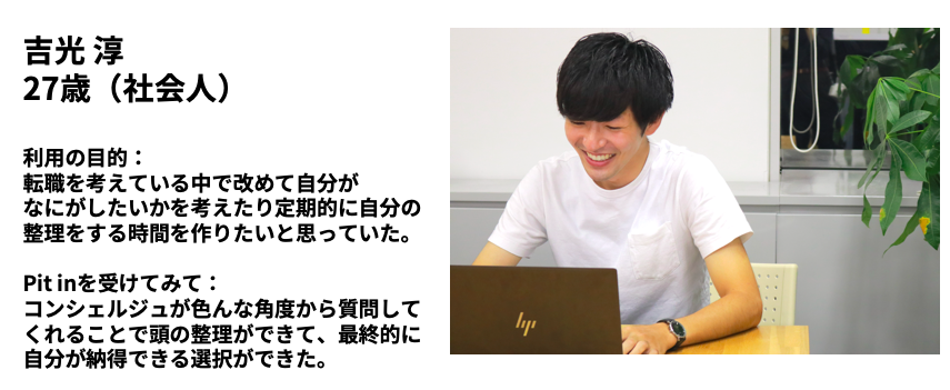 Pit inの聞き手をコンシェルジュと言います。コンシェルジュは利用者の状況に合わせてPit inの60分間で様々問いかけや掘り下げを行い、気付きを共有します。コンシェルジュはときには応援者、ときにはコーチ、ときにはカウンセラーのような役割としてあなたと伴走します。