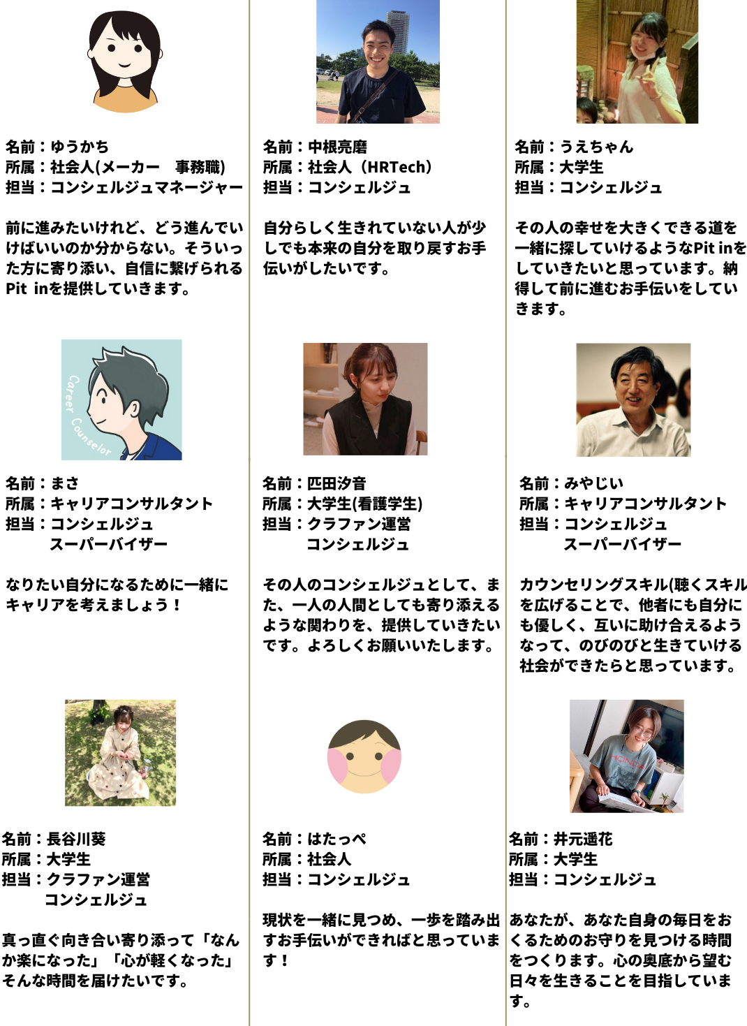 大学では4年間心理学を勉強し、社会人になってからも人材業界のベンチャー企業に入社し、たくさんの“はたらく“に携わってきました。そして、2018年には本格的にカウンセリングやコーチングを勉強しはじめ、このPit inのサービスを仲間内でプレ的にはじめました。2年間でおこなったセッションは200回を超えます。