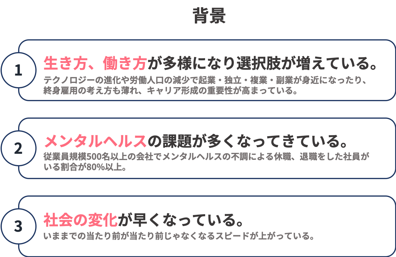 社会の変化が早く、予測不能さが増していく現代において、心と頭を整え、自分自身の指針やあり方を見つめ直しアップデートさせていくことで自分らしい人生を歩むことができると信じています。