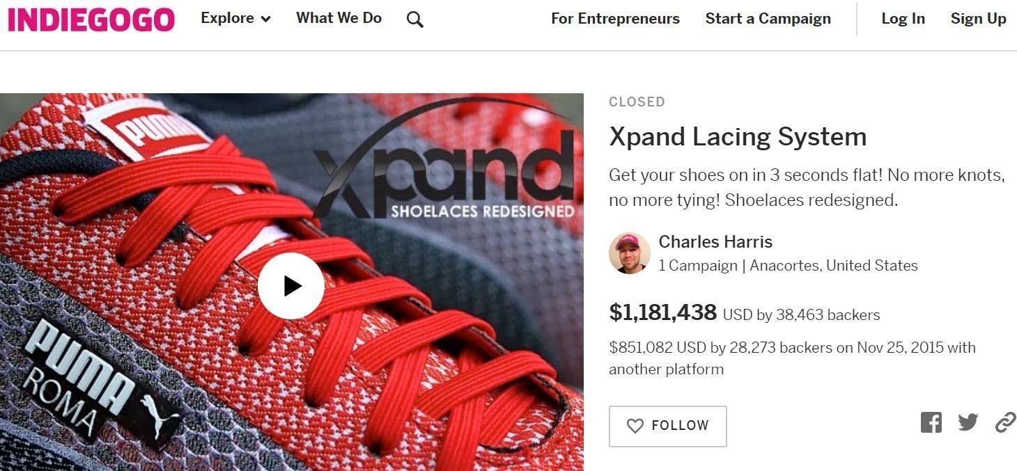 米国クラウドファンディングにおいて、Xpand社が靴ひもカテゴリーでは史上最高の118万1438ドル(約1億2000万)の資金調達に成功しました。