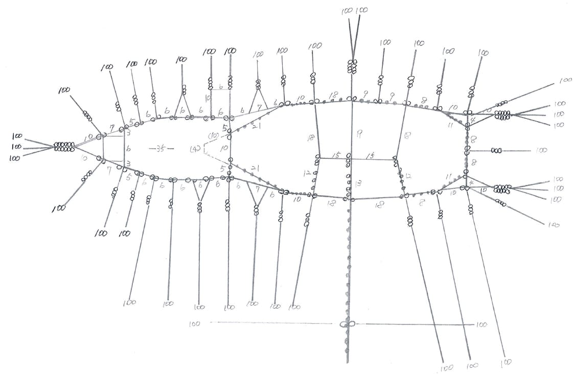 (図:ホクモウ株式会社。定置網模式図。魚は左下から網に入り右へ右へと移っていきます。漁獲するのは右端の魚のみになります。)
