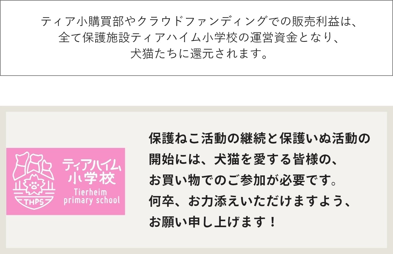 また、これまで保護活動といえば、ボランティアさんたちの負担があまりにも大きく、各々が無理をしながら気持ちで維持されている現状がありました。こうした背景の中、通販サイト「ティアハイム小学校 購買部」で自ら稼ぎ、運営資金を寄付のみに頼らず、お世話をするスタッフには給与が支払われる、持続可能な保護活動の運営を目指しています。