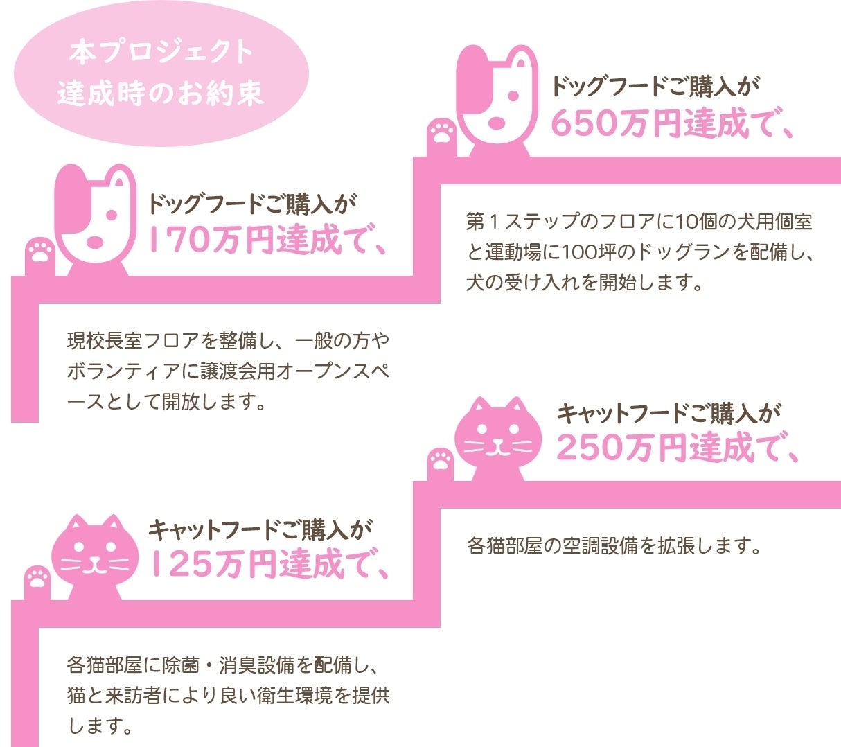●キャットフード未達成の場合: 保護ねこ活動資金として使用させていただきます。その後は購買部及びその他の施策により資金を集め、施設充実にも邁進してまいります。