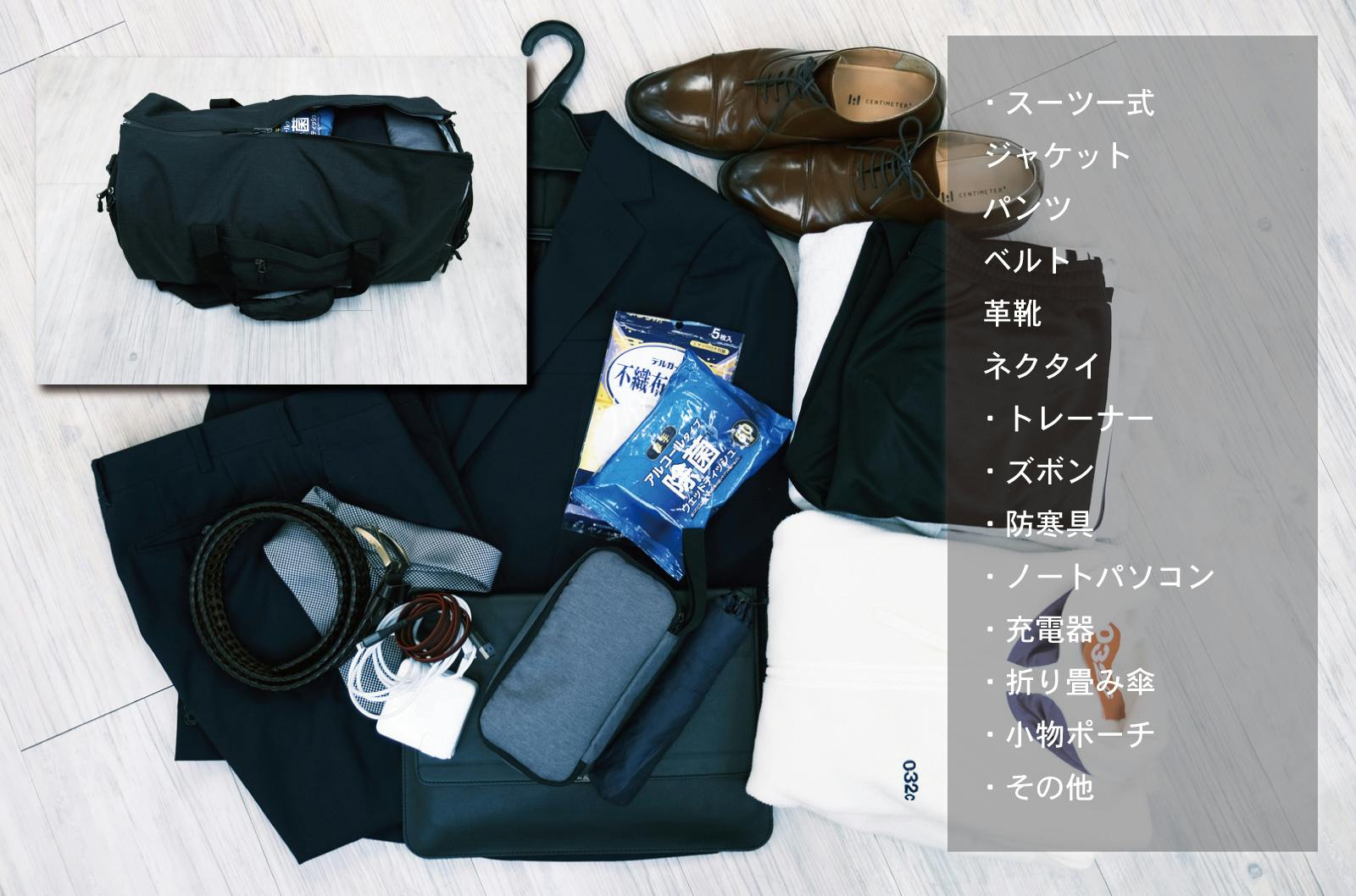 スーツ一式はもちろん、さらに荷物が増えても余裕の大容量です(約35L)。