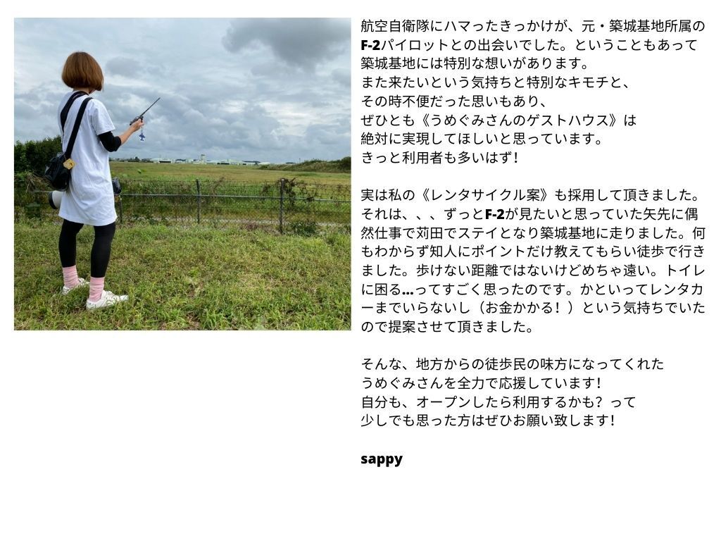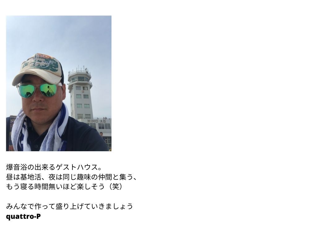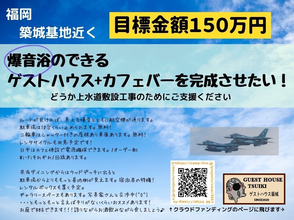 はじめまして。福岡県は航空自衛隊 築城基地近くにオープン準備中のゲストハウス築城(ついき)と申します。当方のプロジェクトに目を止めていただきありがとうございます。
