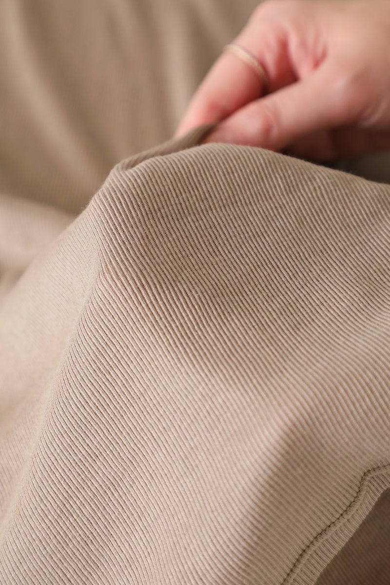 *【テレコ】はリブ編みの一種で、凹凸感のある素材感が特徴。伸縮性が高く、フィット感にも優れています。縦に畝が入っているので視覚効果がありデザインアクセントにもなります。(せひ触っていただきたい究極の肌触りの画像をご参照ください。)