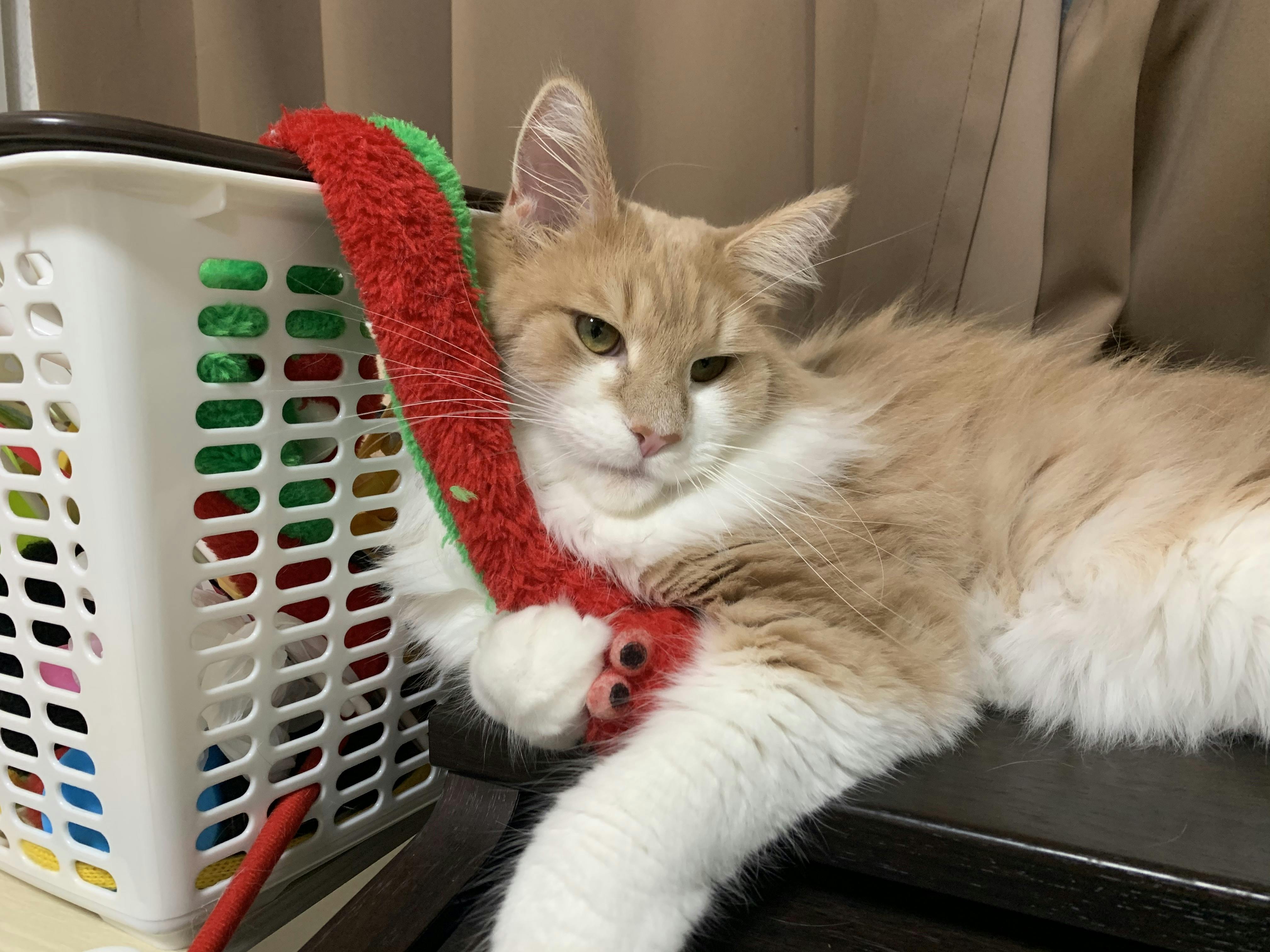 甘えん坊な性格で、常に私達が見える場所にいて、遊んでほしい時にはおもちゃを目の前に持ってきます。