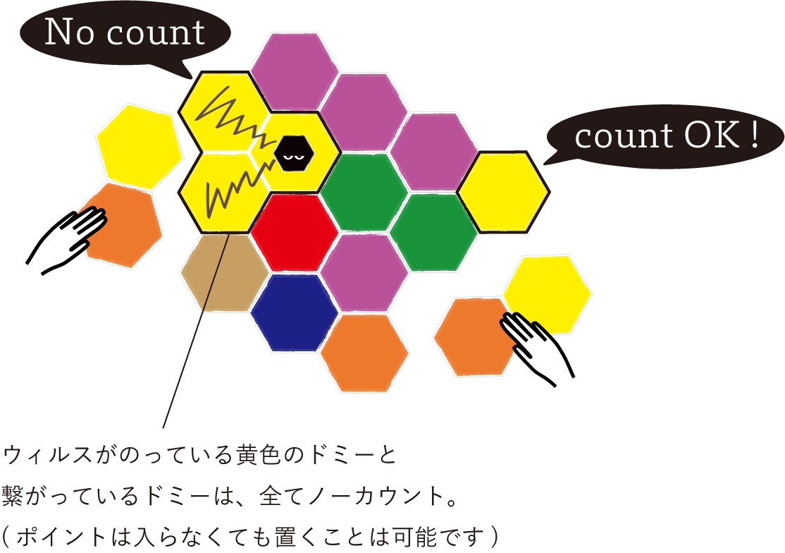 単純ですがウィルス(ポイントをカウントされなくするお邪魔トークン)で妨害したりされたり。