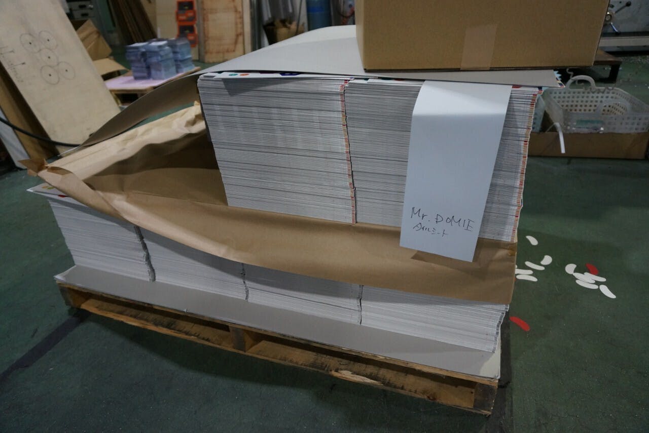 2020/11/04 14:49ドミータイルの誕生! 〜工場見学〜今回は、Mr.DOMIEのタイルについてのお話です。愛知県にある、【株式会社鈴木紙工所さん】に伺い、ドミータイルの製作途中を見せていただきました!社長の鈴木裕一さん自らが、案内をしてくださいました!加工の流れドミーのデザインと入稿 【Dig-A-Doo】↓入稿データを元に印刷と合紙で元のシートの作成 【盤上遊戯製作所さん】↓エンボス加工 【盤上遊戯製作所さん】↓打抜きのカット加工 【株式会社鈴木紙工所さん】※ 通常は打ち抜きカット加工も盤上遊戯製作所さんが行なっておりますが、今回は数量や納期の関係から、協力工場の1つである株式会社鈴木紙工所さんに協力いただき、そちらの工場を見学させて頂きました!いよいよ、ドミータイルにご対面!入ってすぐに、カット済のドミーが大量に!その数、およそ500セット分ほど。↓ちなみに、エンボス加工も綺麗に入っています!↓こちらの画像は、まだカット前のもの。そしていよいよカットされる工程へ。打ち抜きをする機械に、カット前のタイルを1枚ずつ手作業でセッティングします。セッティングが完了したら、スイッチを押して、打ち抜きが始まります!打抜き加工(トムソン加工)打抜き加工とは、トムソン刃というものを使用して、紙を型抜きする加工のこと。※ドミーのタイルは、できるだけ厚めにしたかったので、この打抜き加工ができる厚さの範囲内で、厚めにお願いしました。この機械には、打抜き専用の型が必要になります。その、実際に使用した型がこちら! ↓↓↓ 型の裏面がこちら!紙の伸縮紙は、湿気などの環境によって伸び縮みするそうで(重ねている紙の上・真ん中・下でも湿気の吸い方が違うそうです!)、1枚の紙に合わせて機械をセッティングしても、紙ごとに多少のズレが生じてしまいます。仕上がり状況をその都度、目と手で確認して、調節をしながら1枚1枚丁寧に作業して下さっていました。 機械で抜いていると言う認識でしたが、実際は職人技のひかる工程で驚きでした!特に今回のドミーのタイルの加工には苦戦されたそうで。。。なぜかと言うと、通常はデザインの段階で、カットされる線に対して【塗り足し】を行います。塗り足しとは、仕上がりのサイズよりも大きいサイズでデザイン(カットする線から塗り足し)して、紙の伸縮などによるカットのズレが生じた時でも、端に色のついていない部分が出てしまわないようにするものなのです。ですが、今回のドミーは体の線が、かすれているような線になっています。どうしても、この線の風合いを残したく、塗り足しなしでお願いしたのです。そのため、今回の加工では、ズレを最小限に抑えてもらえるよう、テスト印刷を何度も行い、できる限りズレがないように加工を工夫して頂いたそうです!感謝、感謝です。ひとつひとつ丁寧に作られたドミータイル。早くみなさまのもとにお届けしたいです!左【盤上遊戯製作所 森川聡宏さん】真ん中【株式会社鈴木紙工所 鈴木裕一さん】右【Dig-A-Doo(ディガドゥー) 遠山彬彦】 もっと見る