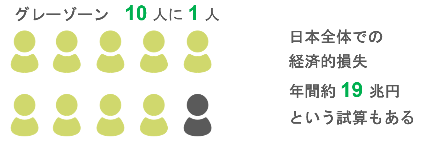 また、グレーゾーンと呼ばれる方々もいます。発達障害の診断基準を満たしていなくても、それに近い傾向や特性のある方です。一般的に10人に1人程度とも言われています。発達障害とは診断されないために特性が自身も周囲も認識しづらく、適切な理解やフォローが得られず、同じ失敗が繰り返されたりすることがあります。そのため、周囲との関係悪化などを経て局所的・慢性的なパフォーマンス低下につながる人も多く、企業にとっても把握しづらいですが大きな損失になっていると言われています。
