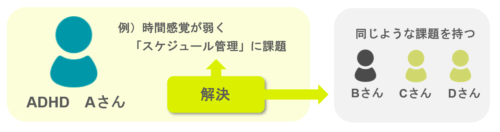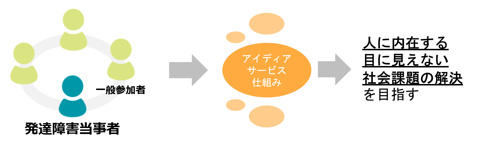 私達が発達障害の困りごとに着目するのは、発達障害の困りごと解決⇒多くの方の困りごと解決につながると考えているからです。