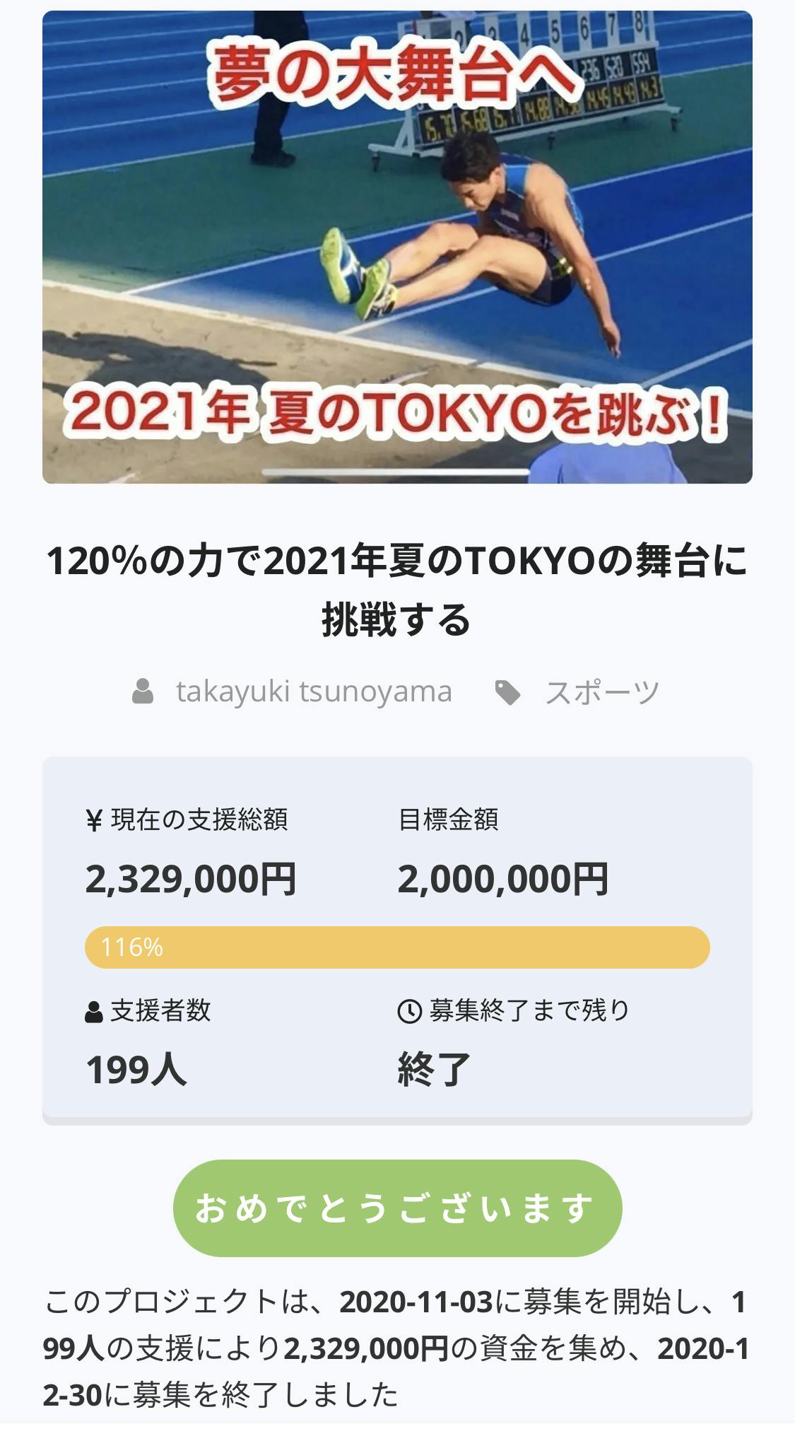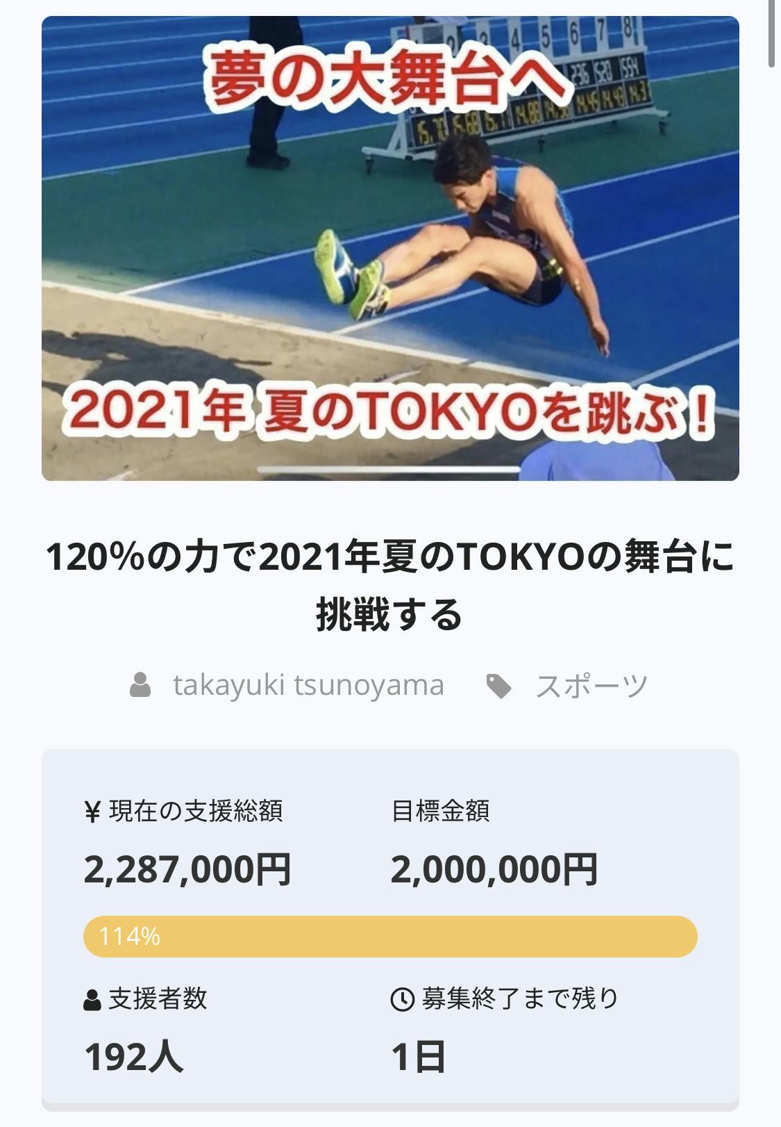 2020/12/29 13:34プロジェクト終了まで36時間となりました!ただ今●目標金額200万円を越え2,287000円ご支援頂きました!●達成した25日170人の皆様のご支援から→192人の皆様にご支援を頂きました。本当にありがとうございます。NEXTゴールに設定した220万円を越える事が出来ました。明日終了となりますが、最後まで宜しくお願い致します。●三段跳びを見た事がない、知らない方是非こちらをご覧下さい!プロジェクト文章にも記載してある「幻と消えた跳躍です。」これを越えるために挑戦し続けています!https://www.instagram.com/p/CI404CuJAf4/?igshid=xnd96z2w9gyg もっと見る